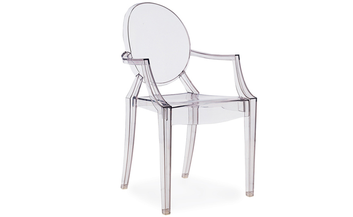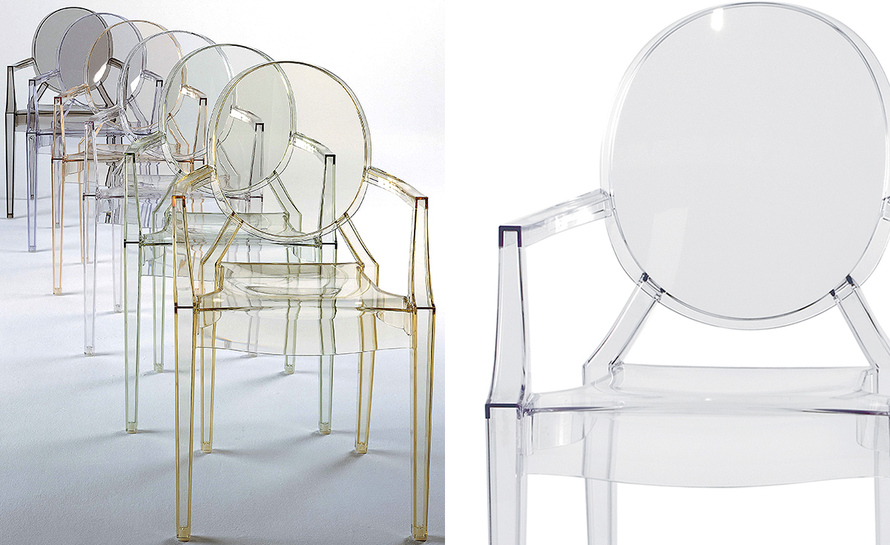 ouis Ghost 是以透明彩色的聚碳酸酯為材質,並有路易十五時期的巴洛克式風格,堪稱世上最大膽的使用聚碳酸脂注入模型中之作。儘管外觀上看起來纖細且透明如水晶一般,但實際上 Louis Ghost 卻是穩固且耐用的,經得起搬動、刮傷及天候的轉變,在收藏上,Louis Ghost 可以堆疊到六個之多。無論放在任何風格的住家或公共空間,Louis Ghost 皆能吸引眾人的目光並帶點優雅與反諷。