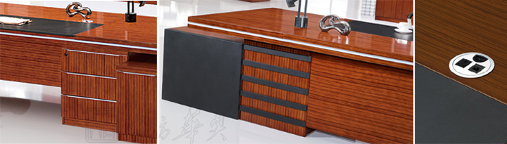 ※ 上图为班台细节图片展示,皮革写字板,黑色纯漆条纹饰边条,圆形不锈钢过线孔!