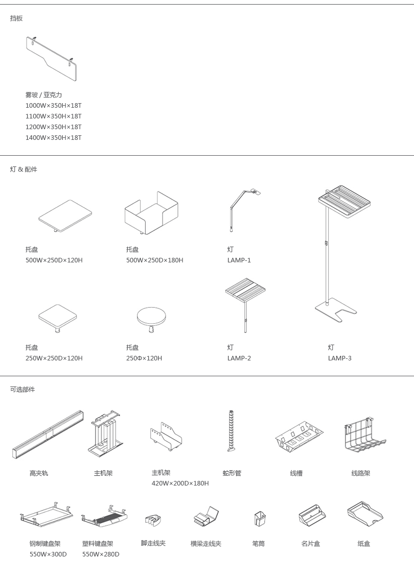 | 2、桌面屏风,多种选择:板材、玻璃、亚克力、吸音板、多功能挂槽; |