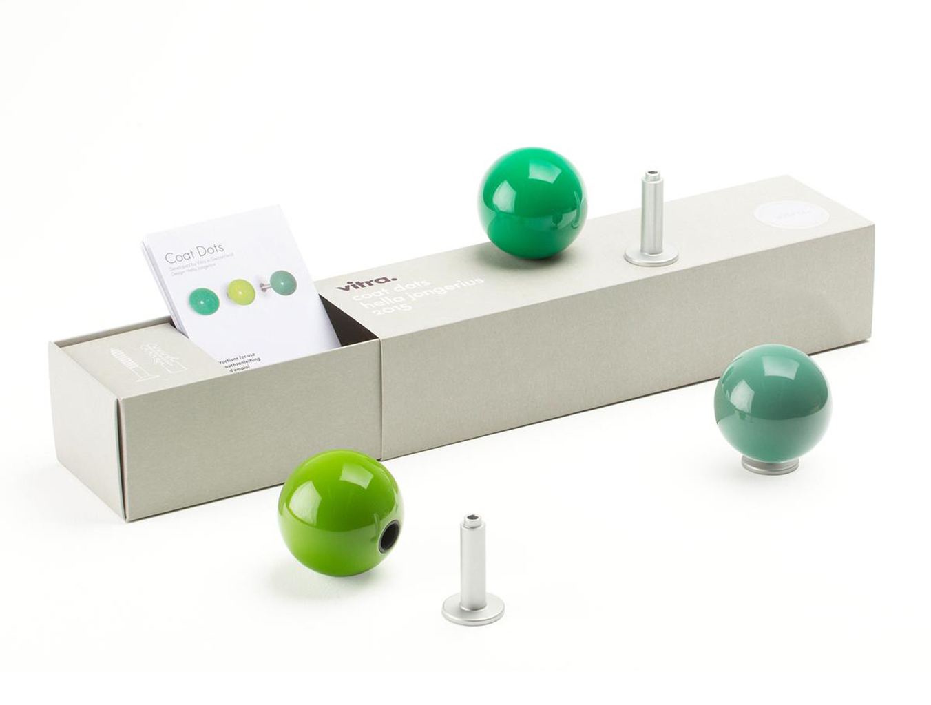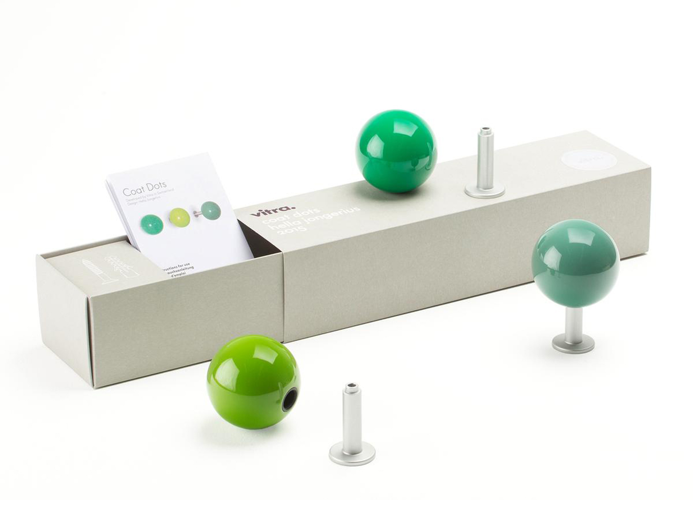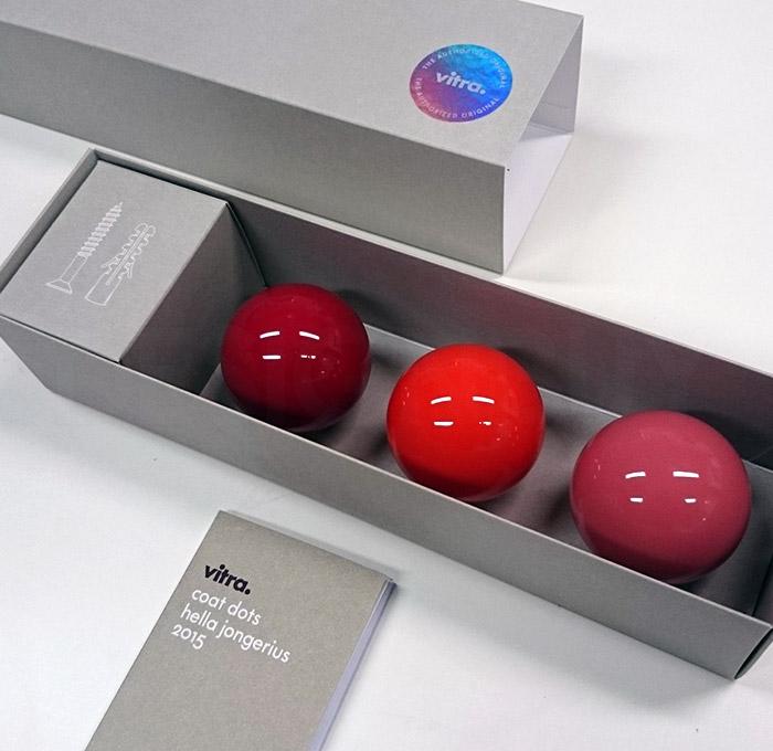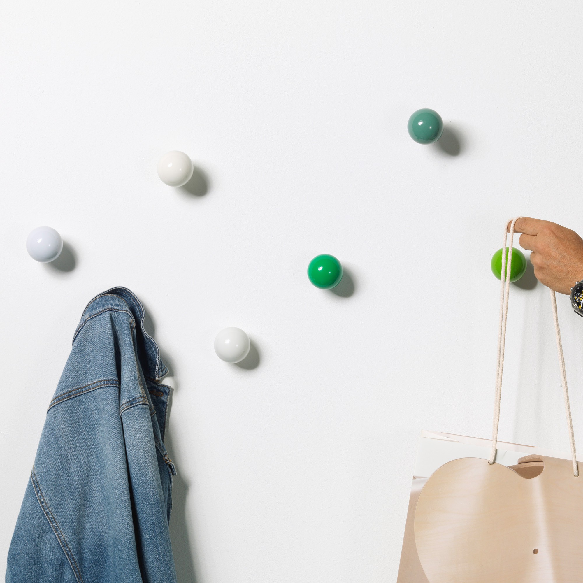 Hella Jongerius的Coat Dots安装在一个可伸缩的销钉上,可以稍微拉离墙壁,为夹克和衣架提供方便的挂钩。 同时,它们也可以简单地用作装饰墙元件。 涂层点有三种颜色协调的球,包括安装材料。