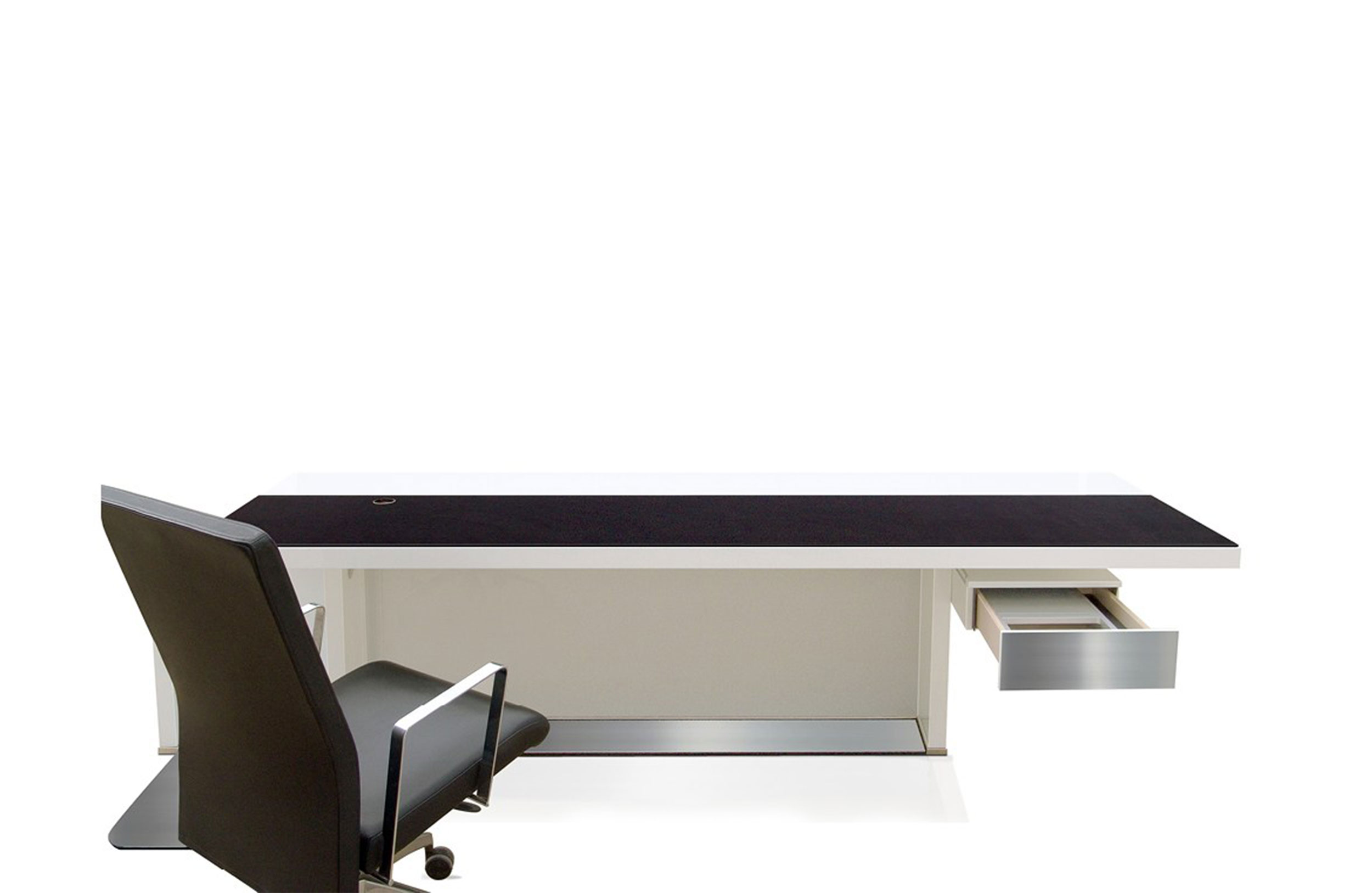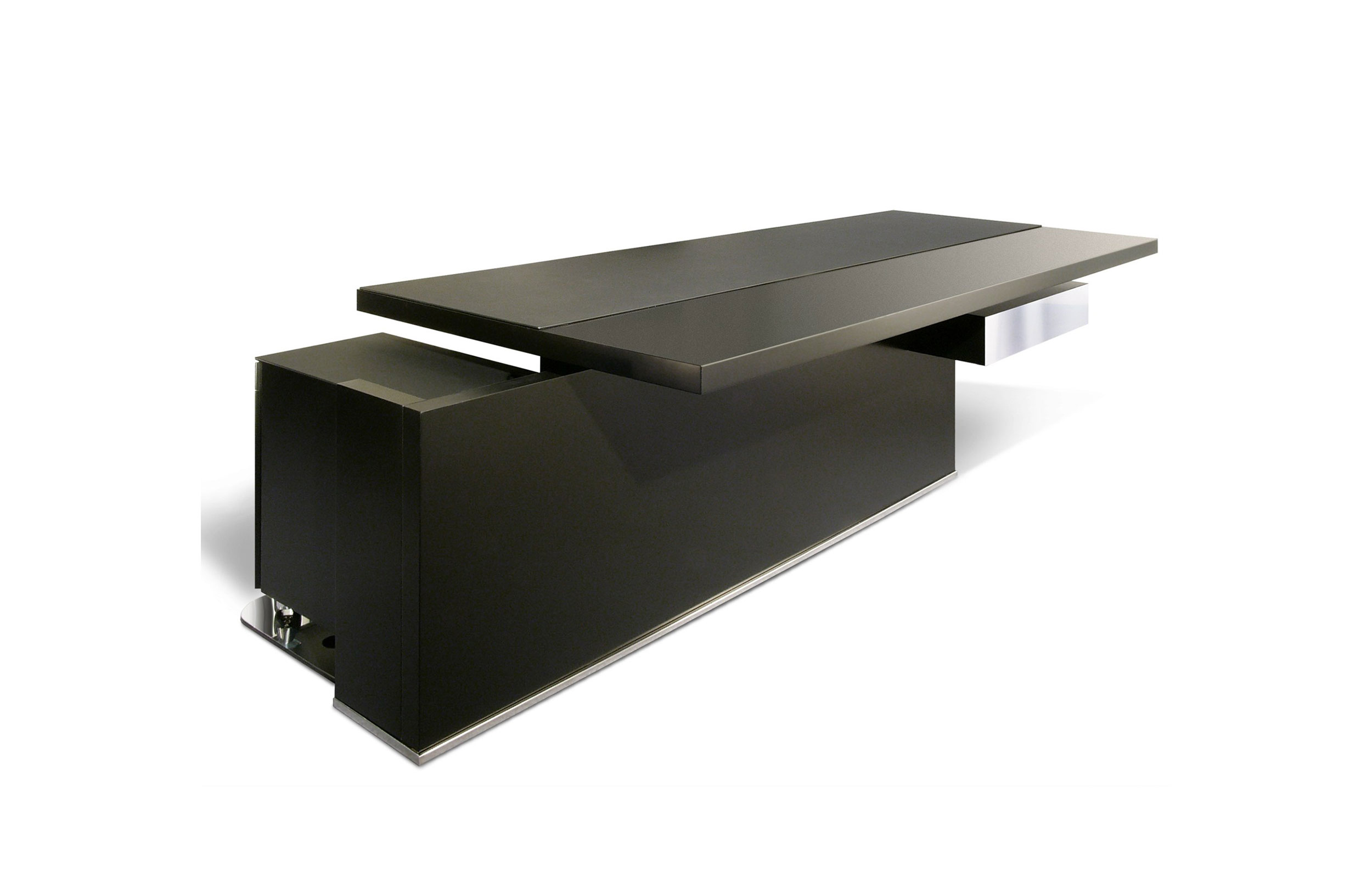 由于其金属核心结构,轻薄和加固的50毫米厚度桌面桌。工作桌面区域采用Techno Leather软垫。50mm结构前板在底部用不锈钢板完成。集成桌面电缆管理。(需要说明的是,桌面机翼在右侧或左侧,相对于工作桌面位置)
