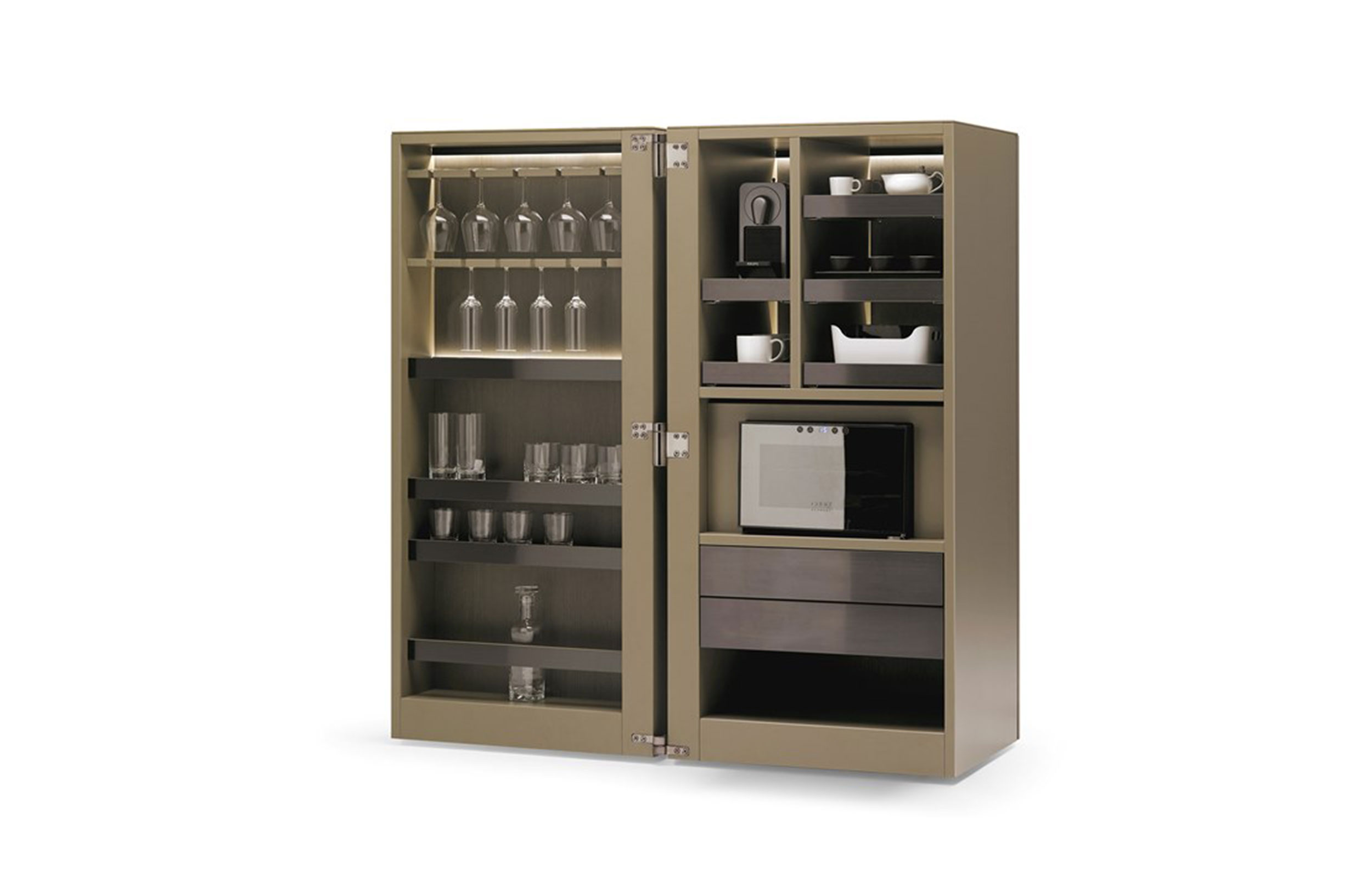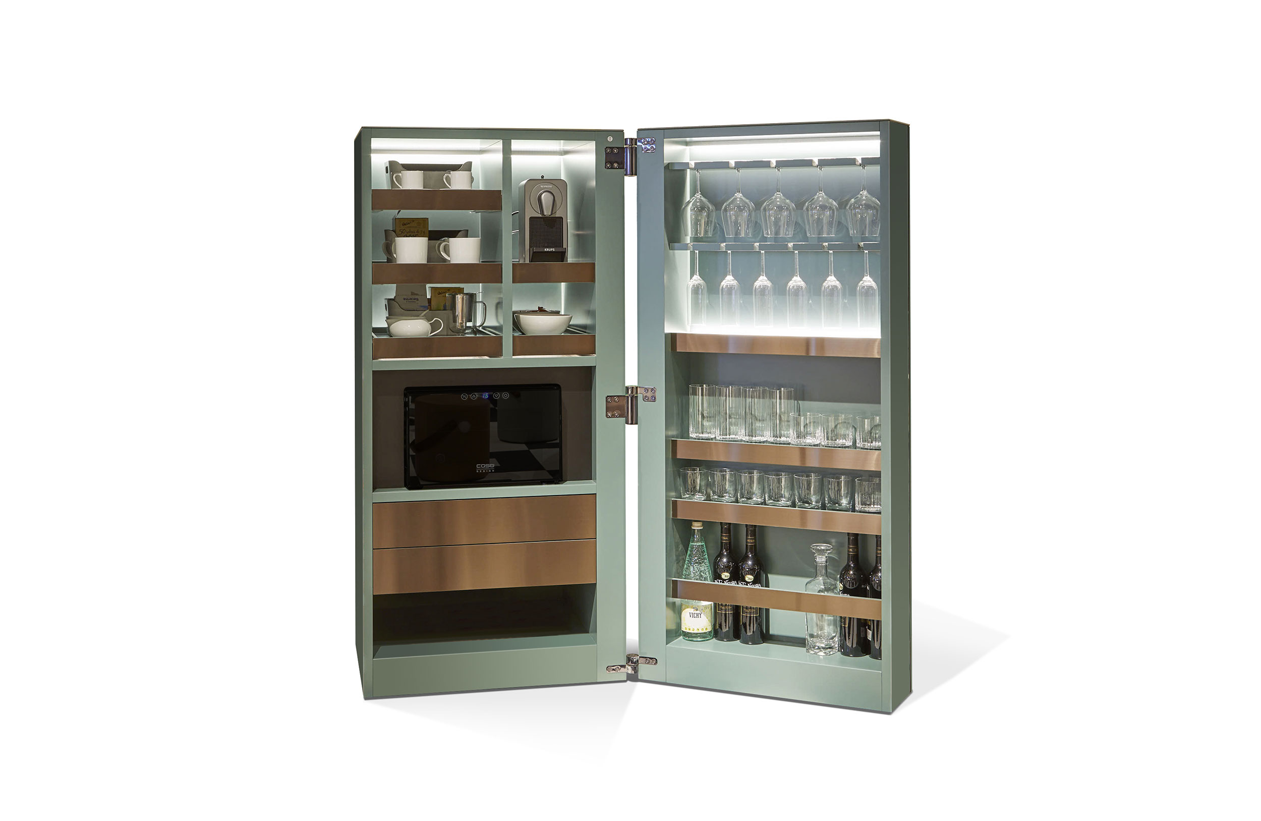 办公室厨房。一个隐藏必要厨具的柜子,可以适当地供应冷饮或热饮。配有Nespresso咖啡机和冰箱/酒架等电器。包括LED照明。表面处理:哑光漆的组合和木材