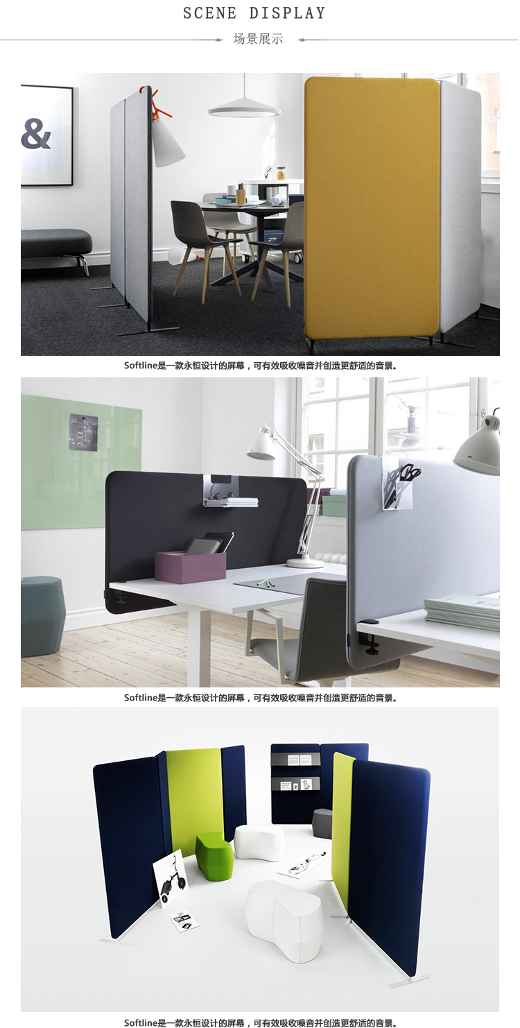 Softline已经成为永恒的经典并非巧合。其巧妙的简约设计和友好的手感,再加上其出色的吸音性能,使其成为全球工作场所的功能性选择。屏幕由安装在实木框架内的吸音填料组成。屏幕两侧都装有织物。金属脚(颜色:铬,黑色,白色和灰色)。高度:5,50或100毫米。连接器可以连续或以一定角度连接多个屏幕。
