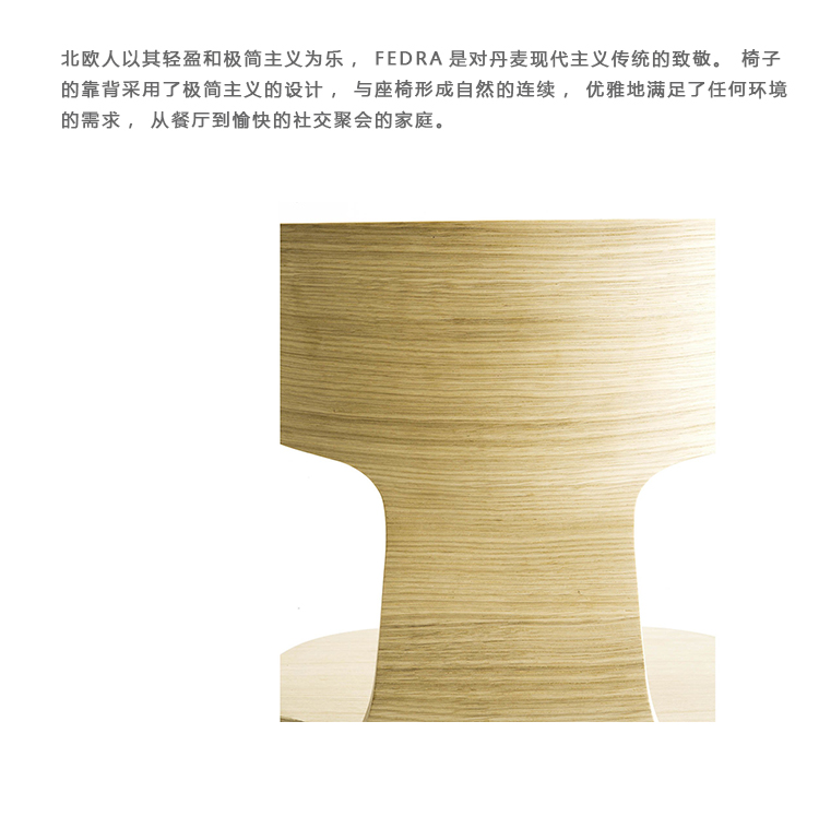 北欧人以其轻盈和极简主义为乐,FEDRA是对丹麦现代主义传统的致敬。椅子的靠背采用了极简主义的设计,与座椅形成自然的连续,优雅地满足了任何环境的需求,从餐厅到愉快的社交聚会的家庭。