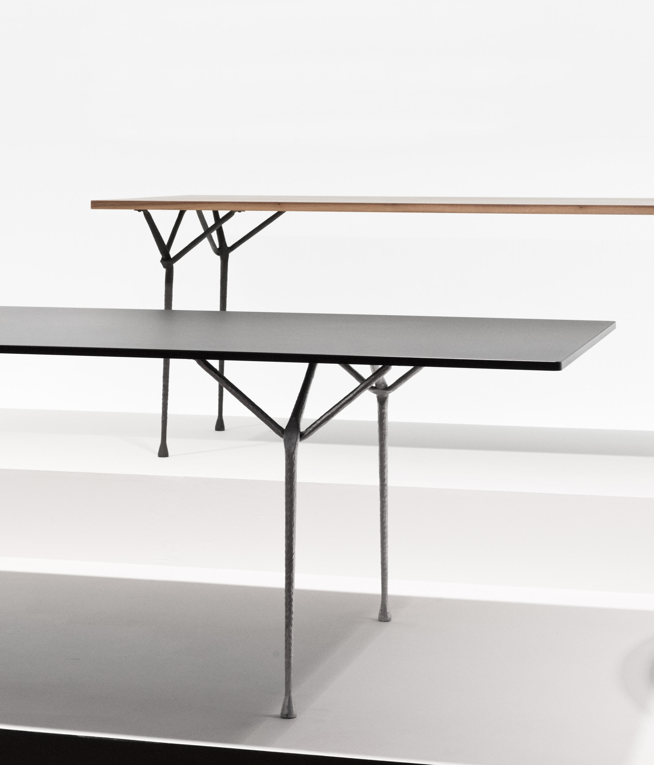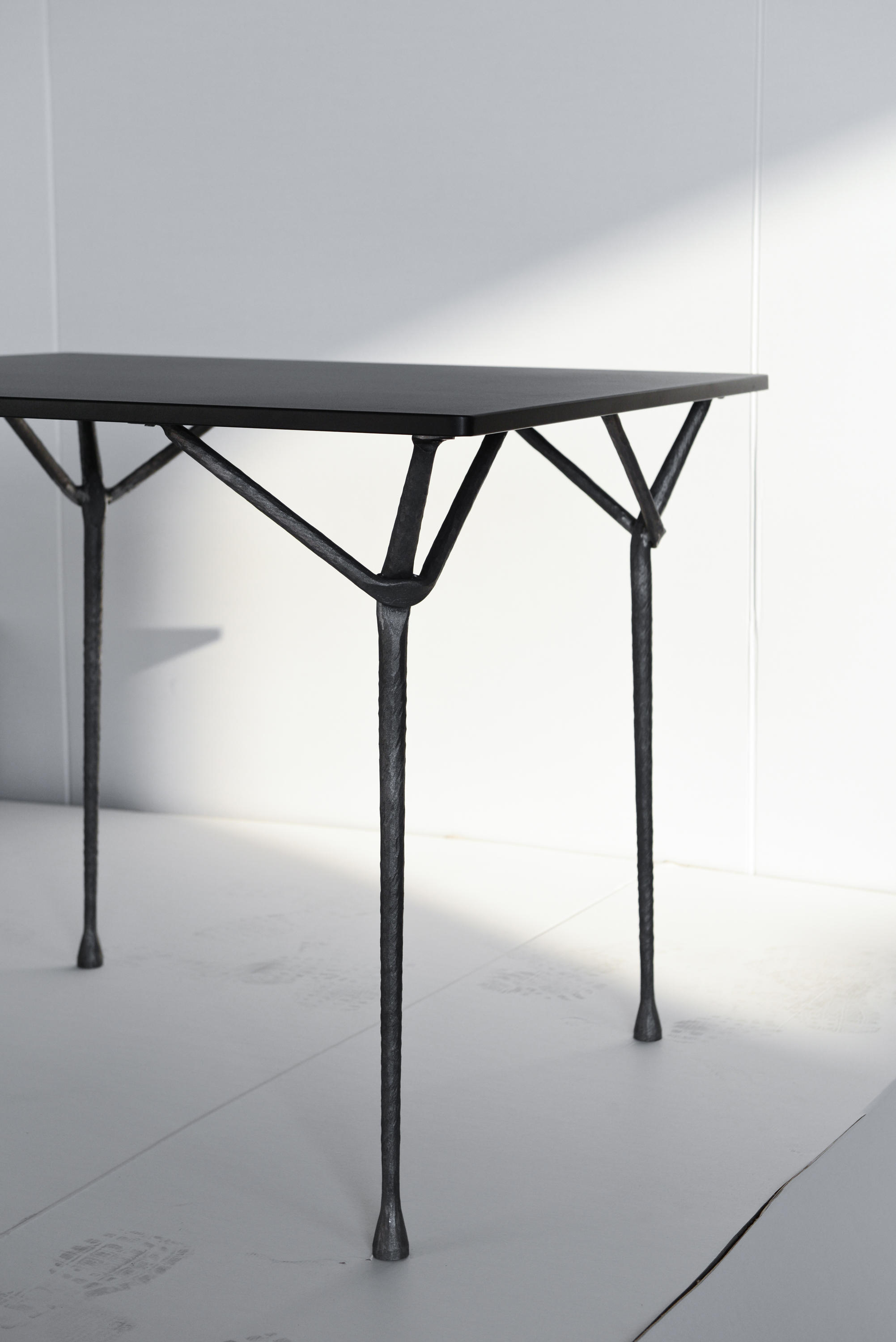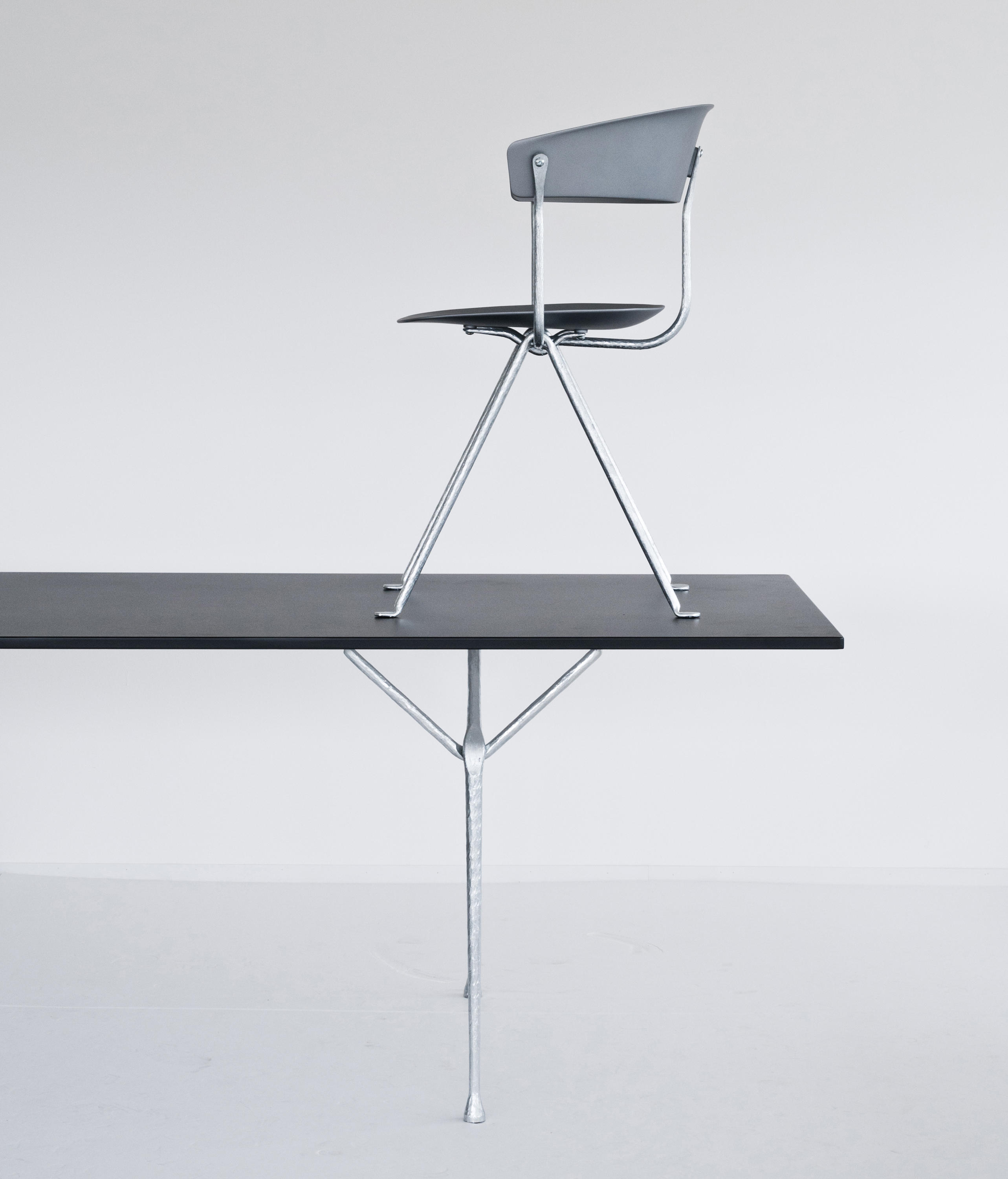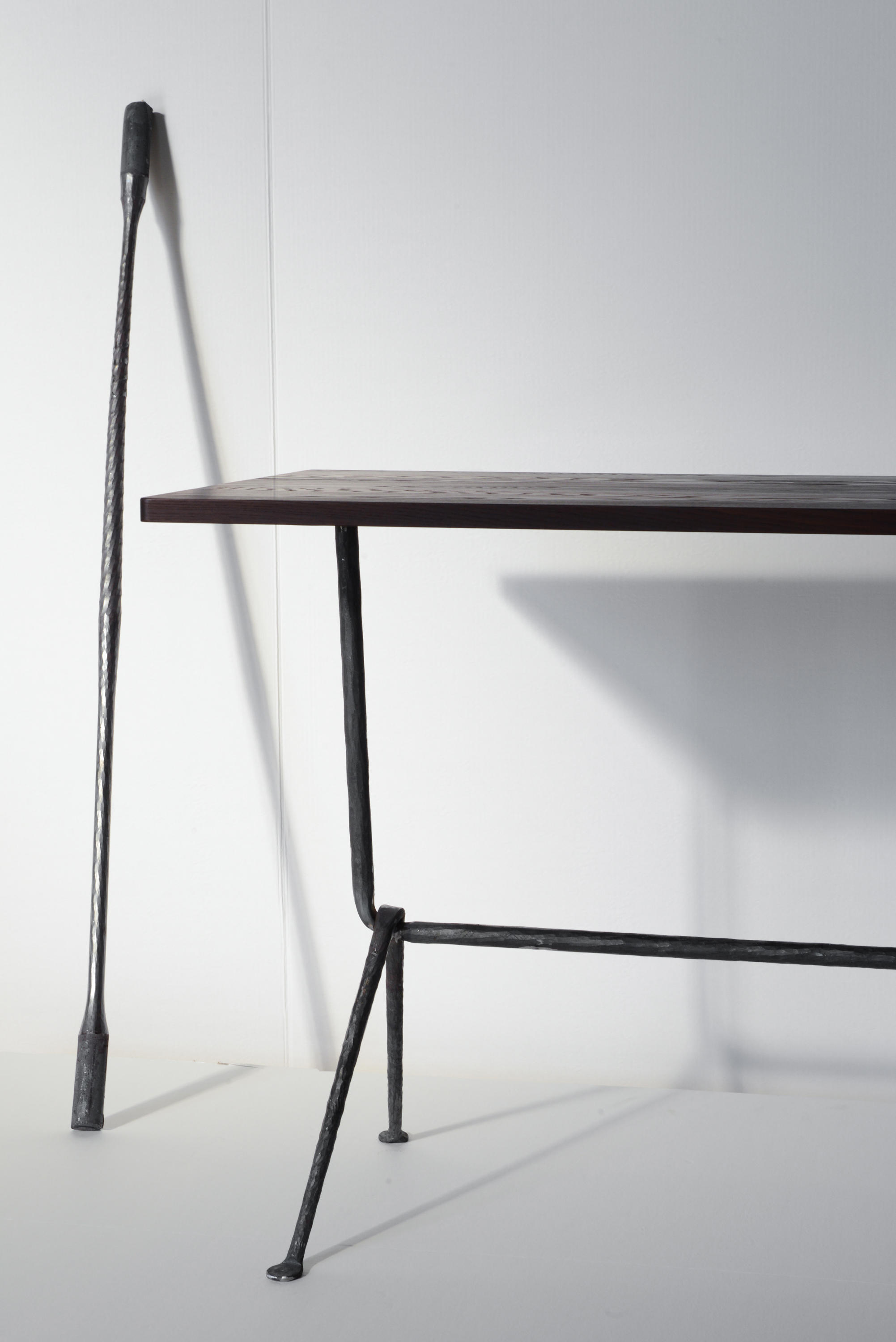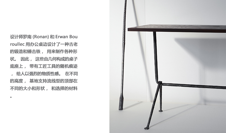 设计师罗南(Ronan)和Erwan Bouroullec用办公桌边设计了一种古老的锻造和锤击铁,用来制作各种形状。他们的目标是“利用这个古老的制造过程,给它一种新的视觉语言,”Erwan说。语言具有真实性和思想性。罗南指出:“通过对那些赋予它们形状的工具的随机、机械痕迹的反射,这些东西给工业计划带来了一股清新的气息。”