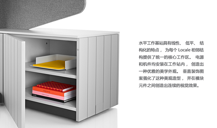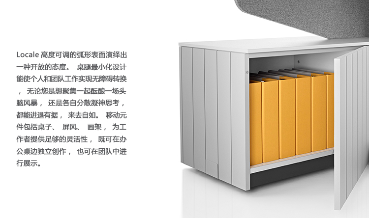 Locale能帮助机构利用和管理开放式的办公空间,通过该系统,员工能在坐姿或站姿,或是在团队工作与单独工作状态之间,实现无缝转换。Locale消除了视觉和实体障碍,并将整个开放式工作空间的建筑格局压缩成紧密联接的相邻结构,有助于员工更得心应手地工作,并保持彼此沟通顺畅。