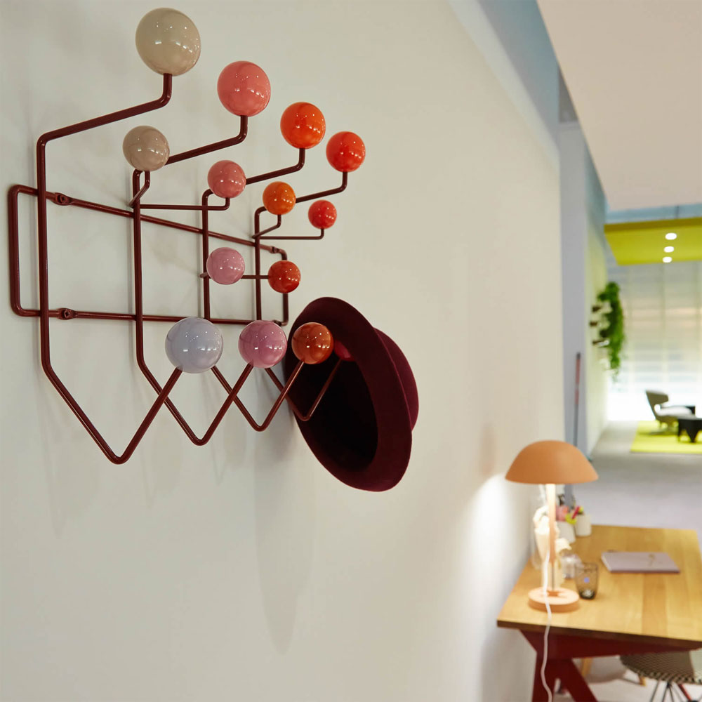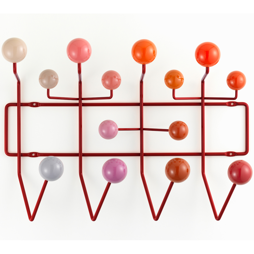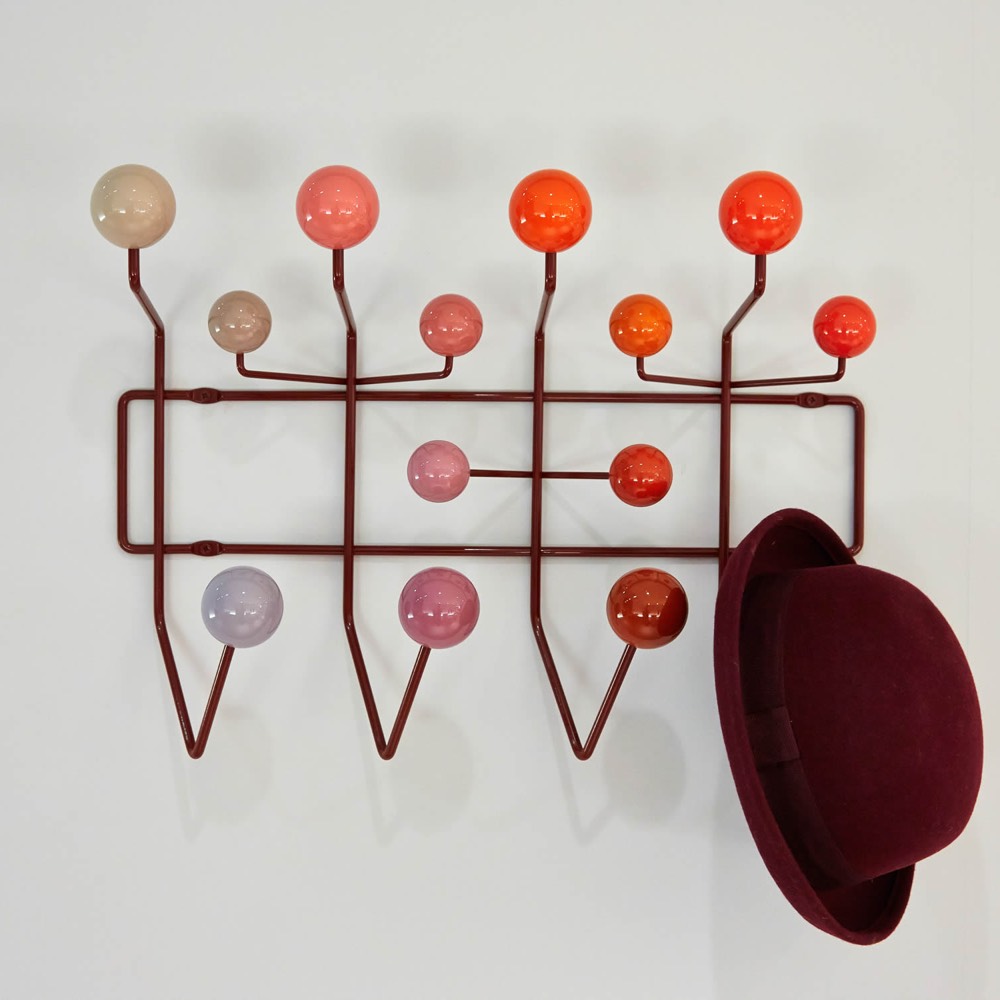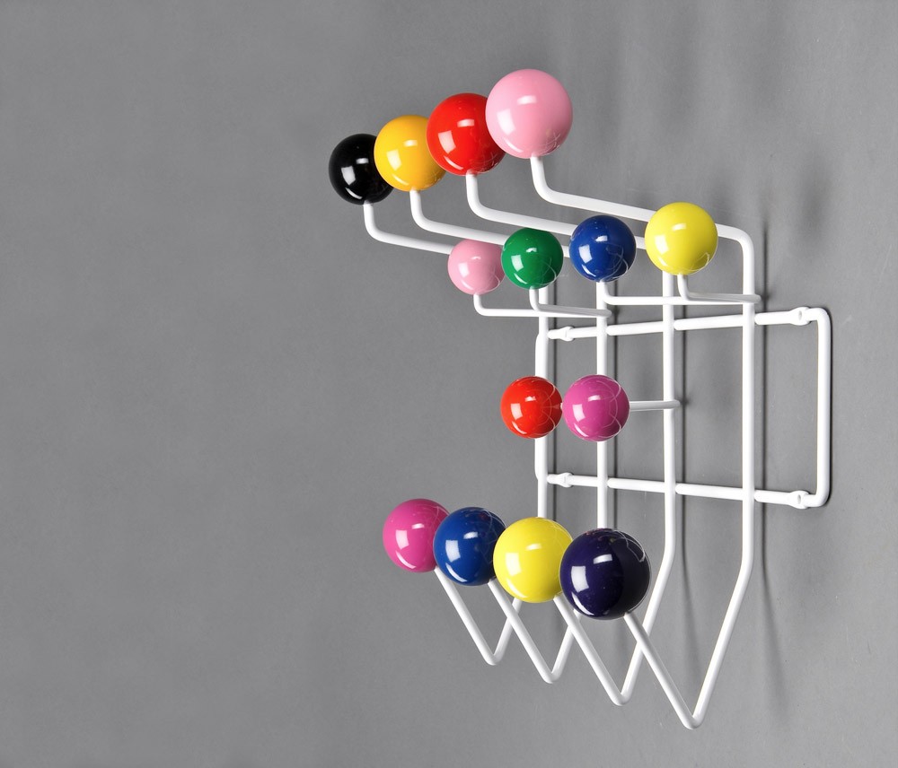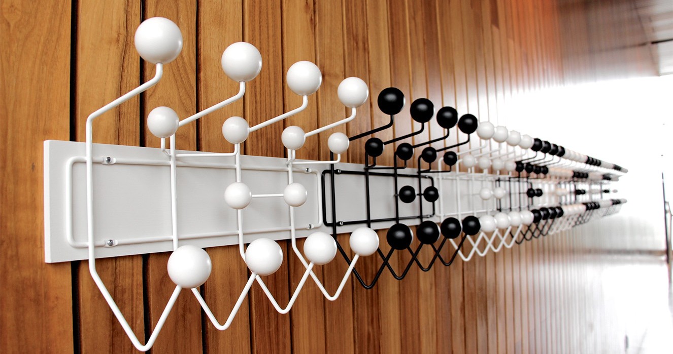 查尔斯和雷·埃姆斯把他们的衣架全部挂起来,把日常的衣架提升到一种创造性和趣味性。最初是用多色的挂钩和白色的金属线框制作而成,从那以后,它的材质和配色都更加忠实于原作的复杂和玩味。