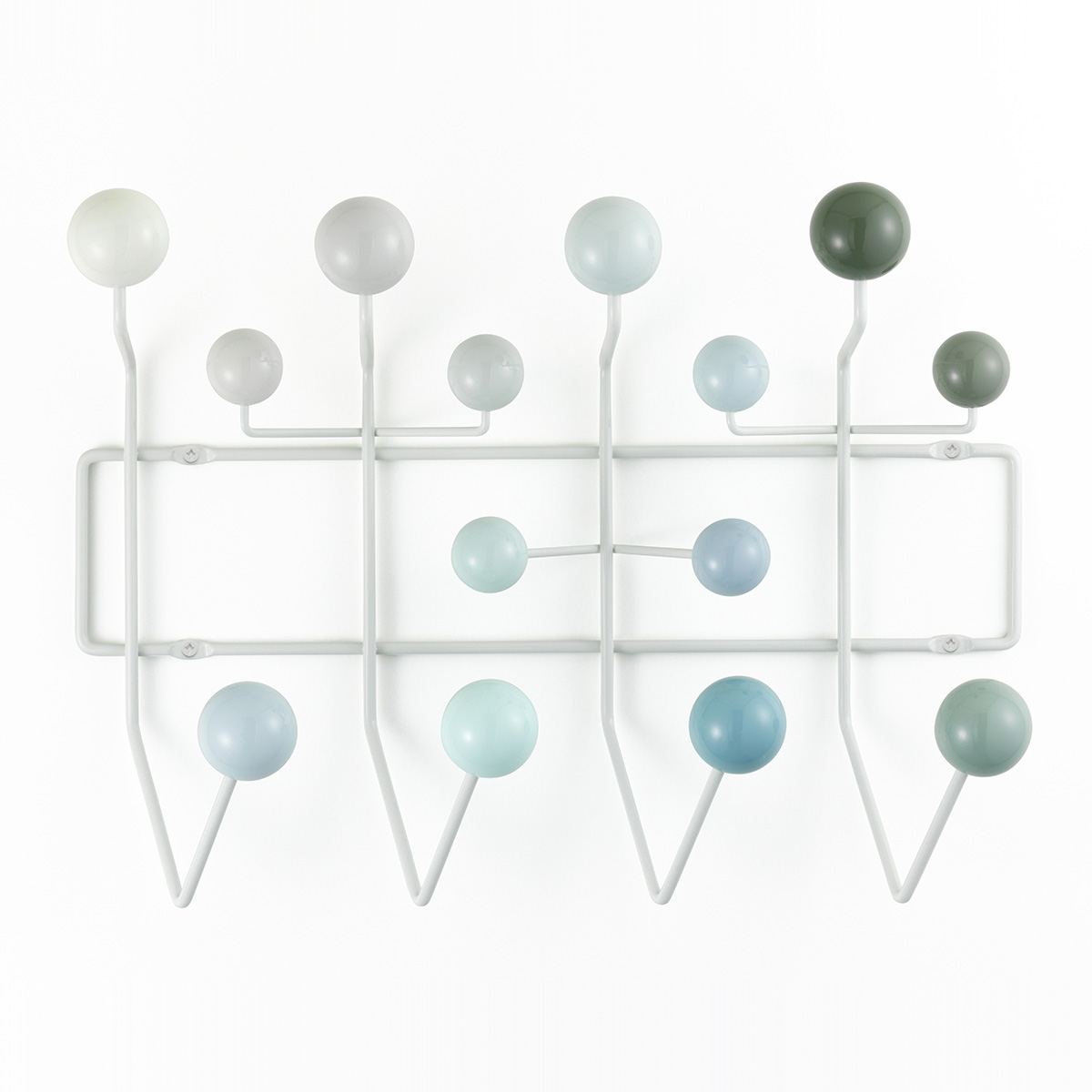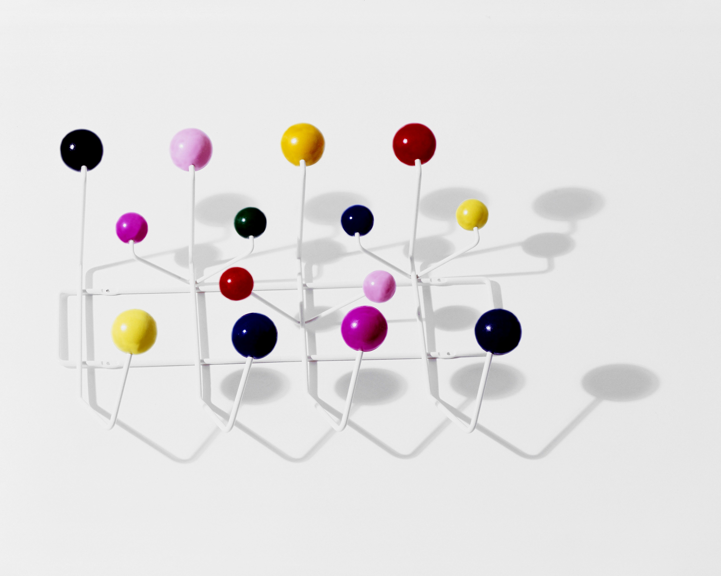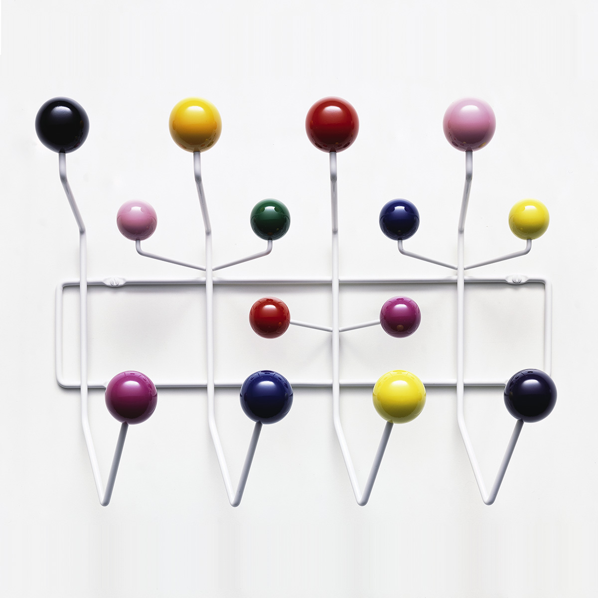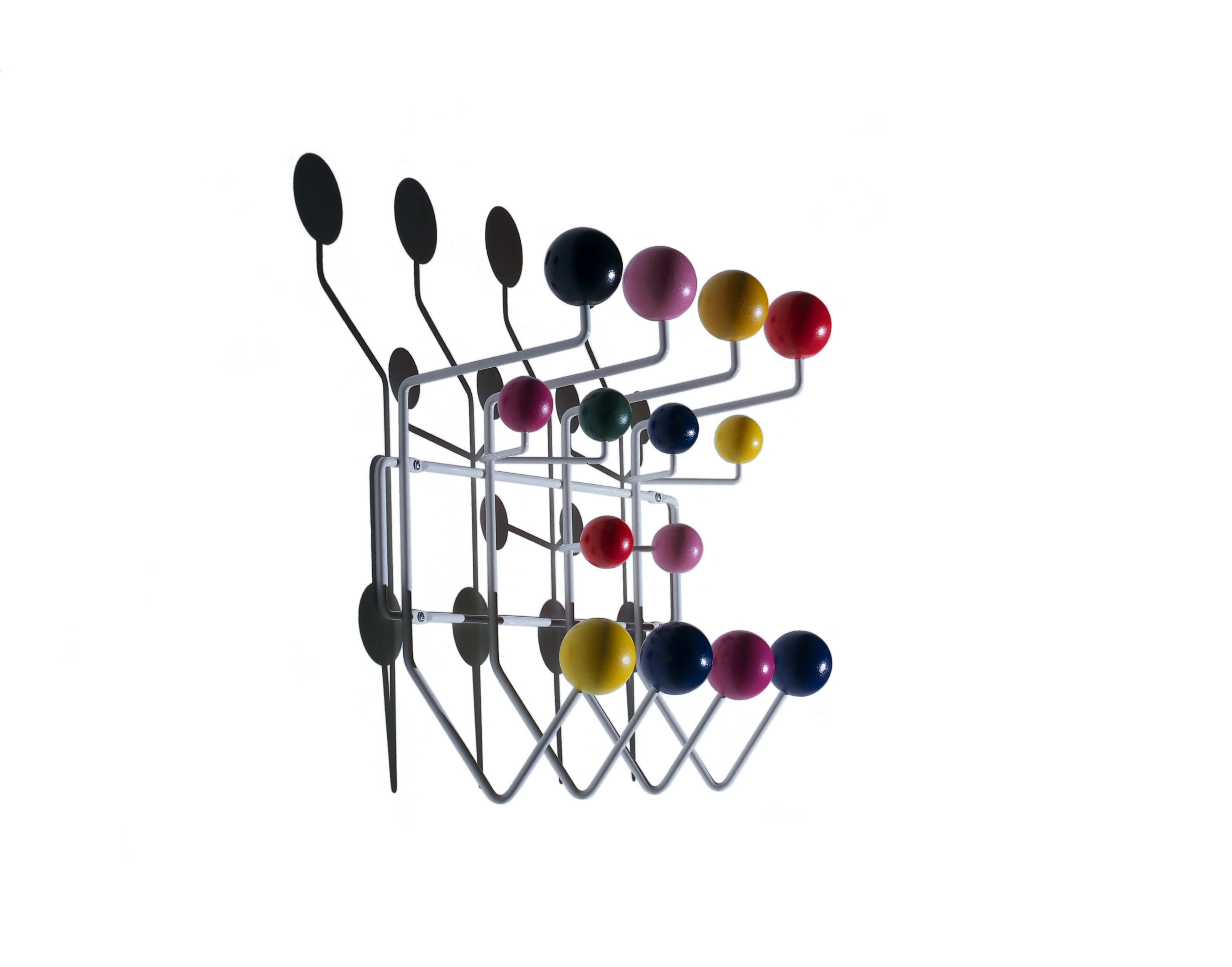 查尔斯和雷·埃姆斯把他们的衣架全部挂起来,把日常的衣架提升到一种创造性和趣味性。最初是用多色的挂钩和白色的金属线框制作而成,从那以后,它的材质和配色都更加忠实于原作的复杂和玩味。