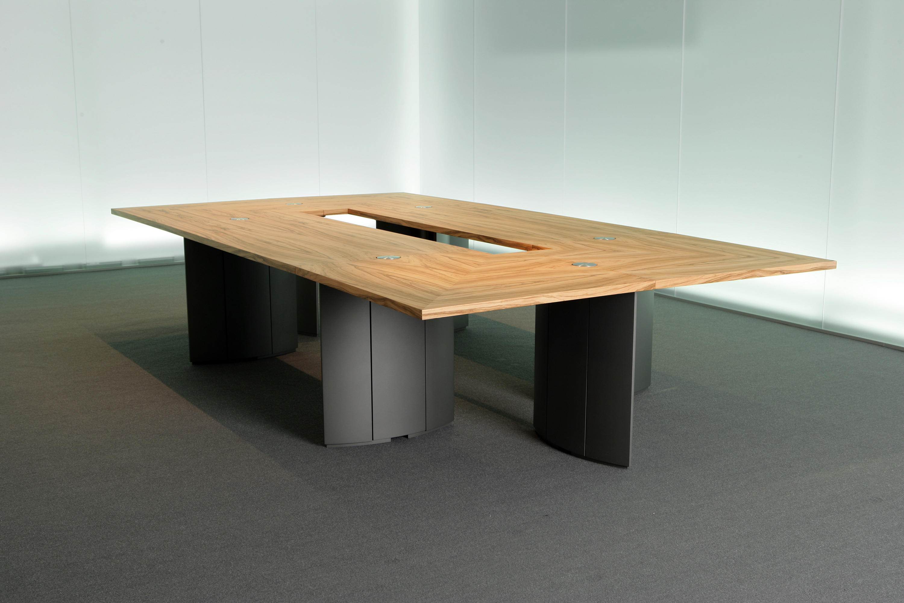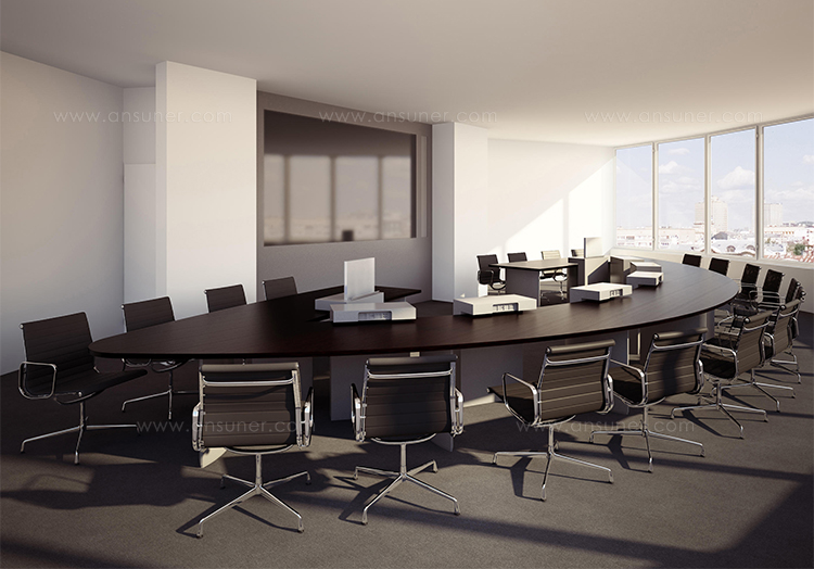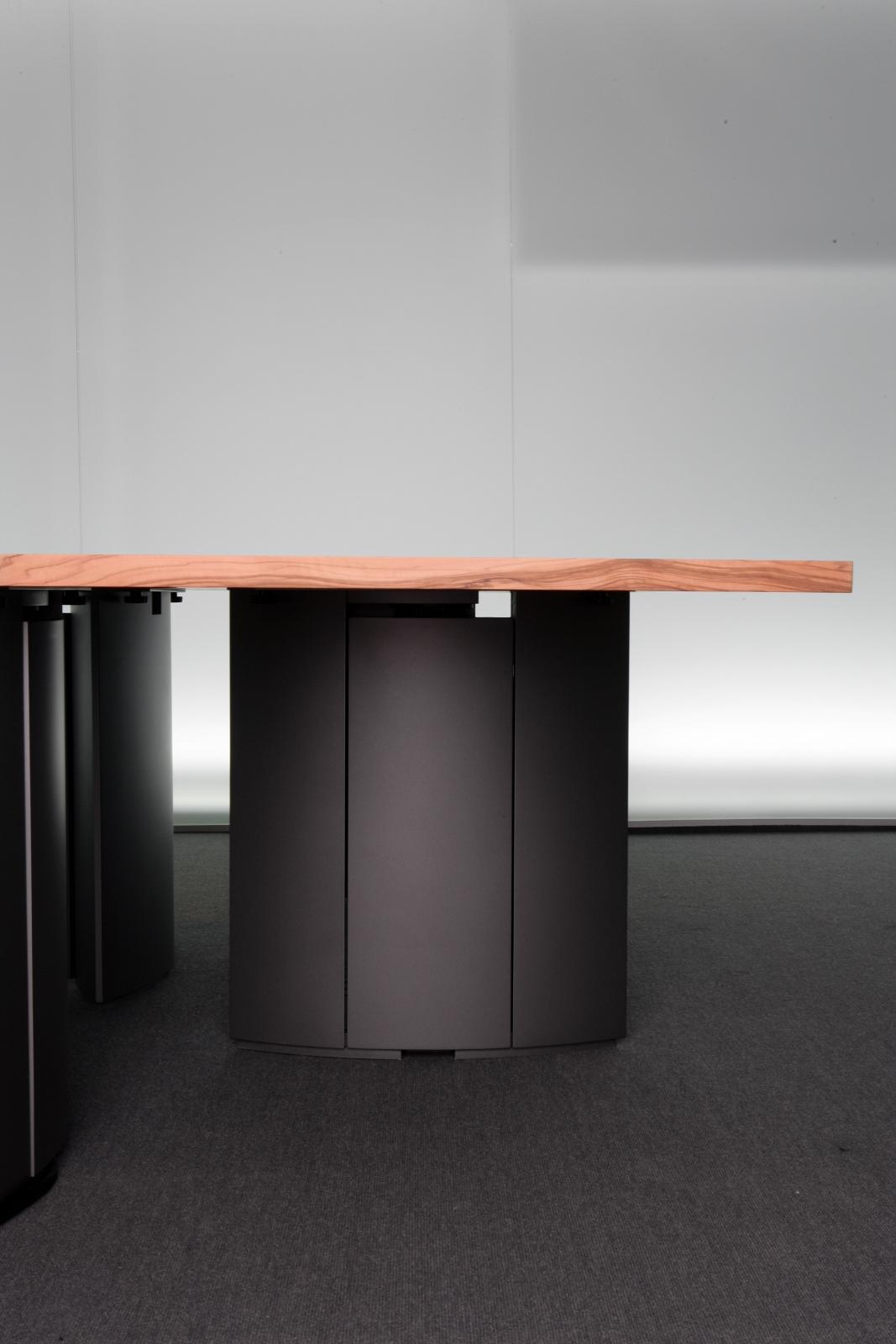 灵活的可变型会议桌系统,看上去像是固定安装的会议桌,且非常稳固。椭圆形的桌腿无需借助任何工具可在短时间内轻松组装和拆卸。32mm厚的桌面、可根据客户需要定制其形状和大小。椭圆形的桌腿可隐藏技术集成和走线系统。