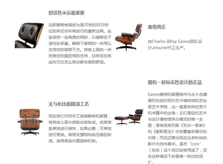自从我们于1956年开始生产Eames躺椅和脚凳以来,之后便再也没有什么产品能超越它,现在依然如此。如今该组合依然是世界上最令人垂涎?、最惹人心爱的Eames设计作品之一。
