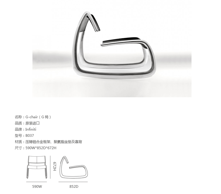 G-Chair(G椅)具有独特的风格、 舒适和独特的个性,其造型就像一个雪橇,富有趣味的造型相当吸引目光,因而引发积极的内涵,舒适但同时也充满了幸福和愉快的正能量心情。制作采用压铸铝合金框架、聚氨酯坐垫及靠背,有白色,黑色和红色的铝制框架可供选择。