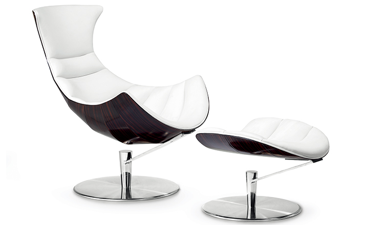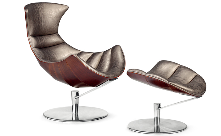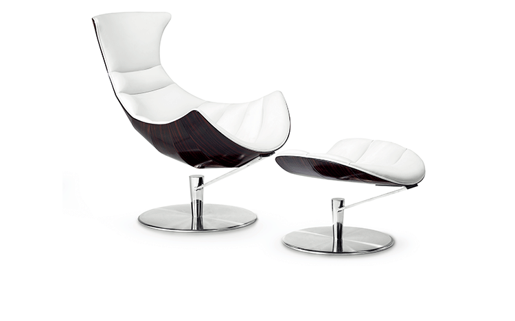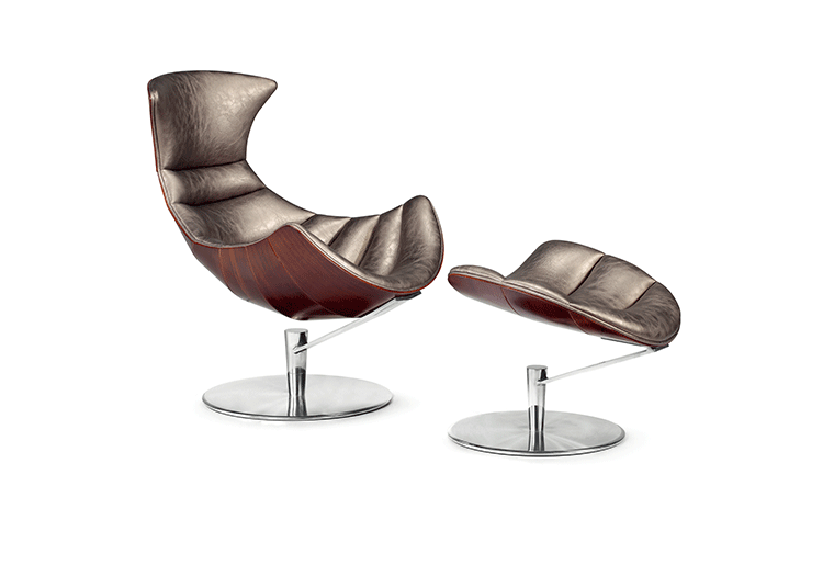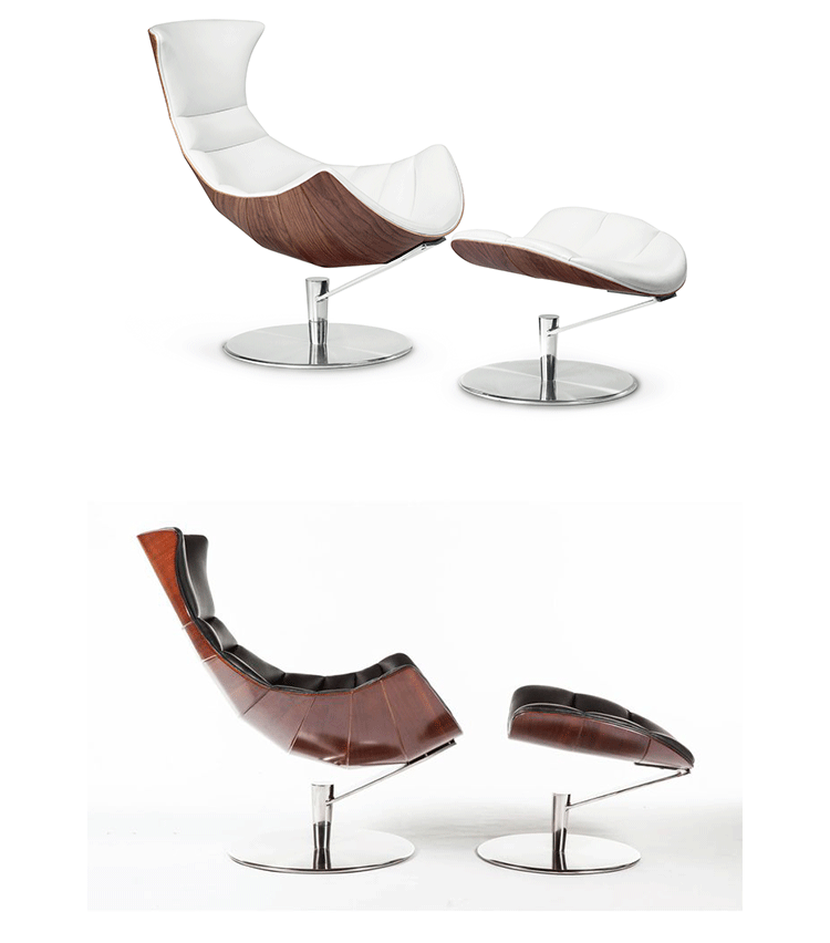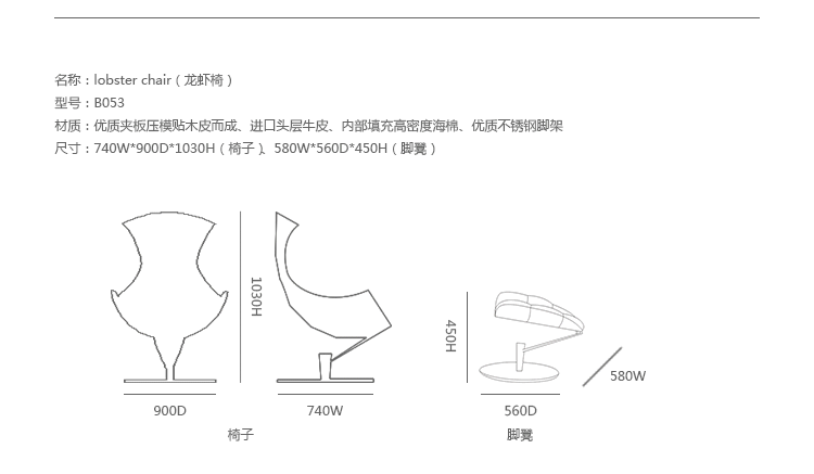 丹麦著名设计师Oluf Lund & Eva Paarmann设计的这款龙虾系列包含,Lobster Chair(龙虾椅)、Lobster Ottoman(龙虾脚踏)及组合搭配Lobster Chair and Ottoman(龙虾椅&脚踏)。此款椅子造型就像一只龙虾,采用优质夹板压模贴木皮而成、进口头层牛皮、内部填充高密度海棉、优质不锈钢脚架制成,简约立体的流线融入符合人体工学及空气动力学的结构设计,摆脱传统办公椅单调冷硬的刻板印象,达到舒适久坐的基本需求。