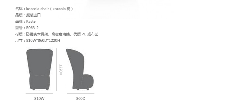 Kastel是一个在室内装饰领域极具影响力的公司,该公司具备高水平的综合生产能力,是一个充满活力的公司。Kastel公司产品多种多样,包括办公座椅,社区座椅和家庭座椅等等。Kastel在对人体工程学进行深刻研究之后,制定了现在的生产线,产品的设计以舒适为主,在生产过程中每一步都严格遵循这一宗旨,为客户提供高性能的产品,满足客户对舒适的基本要求。这也是Kastel公司的经营理念。koccola chair(koccola椅)由设计师为Kastel公司设计的产品,制作采用防霉实木骨架、高密度海绵填充、优质PU或布艺扪面,可以用在等候、交谈及会议室等区域。