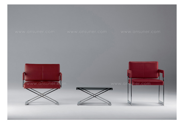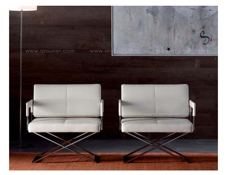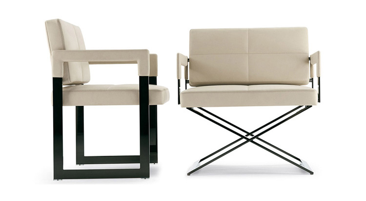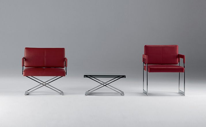 "Leather皮革椅系列家具线条干净简明,“X”交叉造型或者“H”造型脚架支撑着坐垫,新颖独特,由Jean-Marie Massaud设计。它采用外露的金属架,有三种不同的做工,座椅为聚氨酯泡沫材料,靠背较低,坐垫宽敞。有两种面料可供选择:天然皮革和纺织面料。两种款式都有皮革和染色纺织面料的扶手和同款的靠枕。沙发椅的造型形式严谨,它的特点和个性特征与Poltrona Frau现代室内家居的设计非常统一协调。