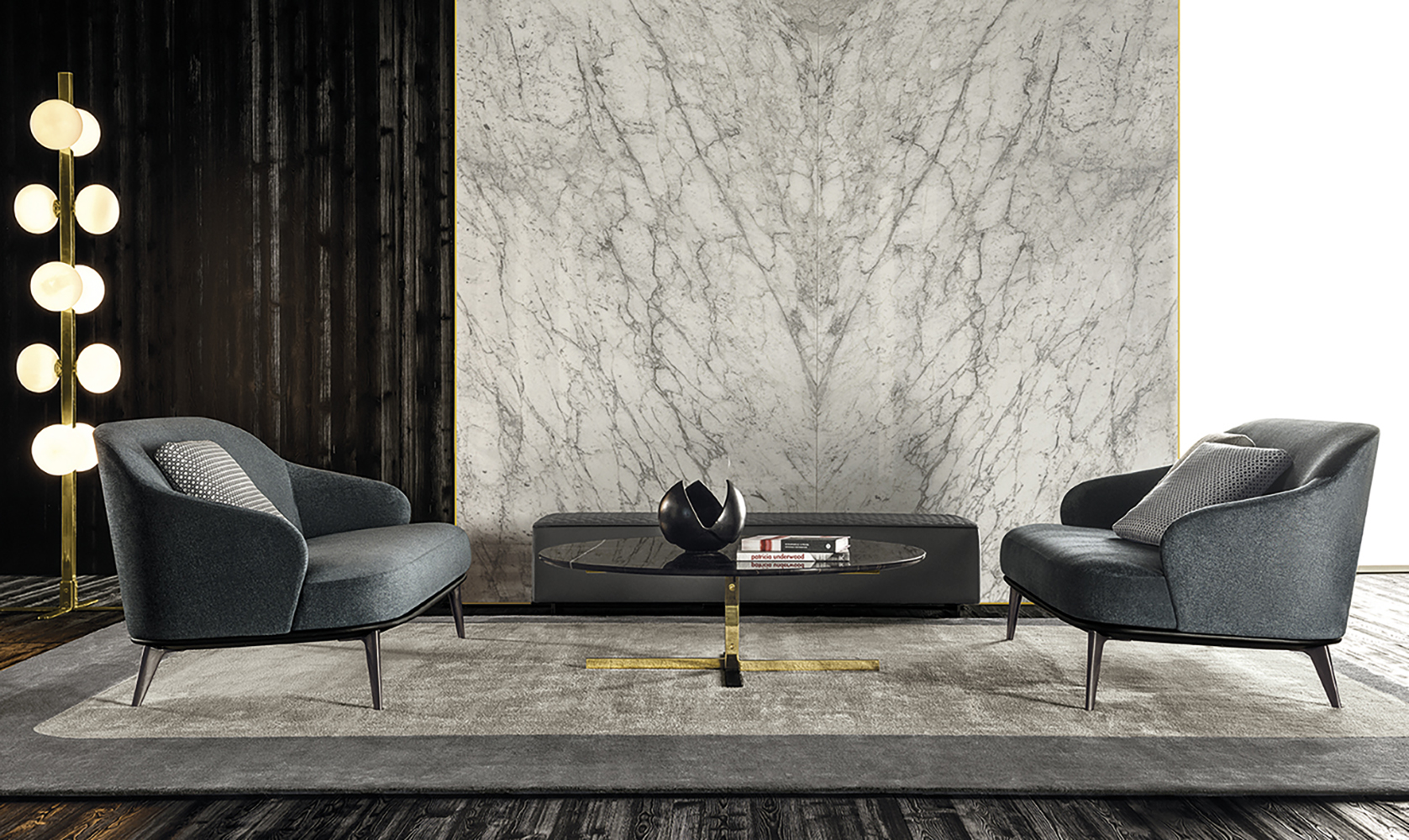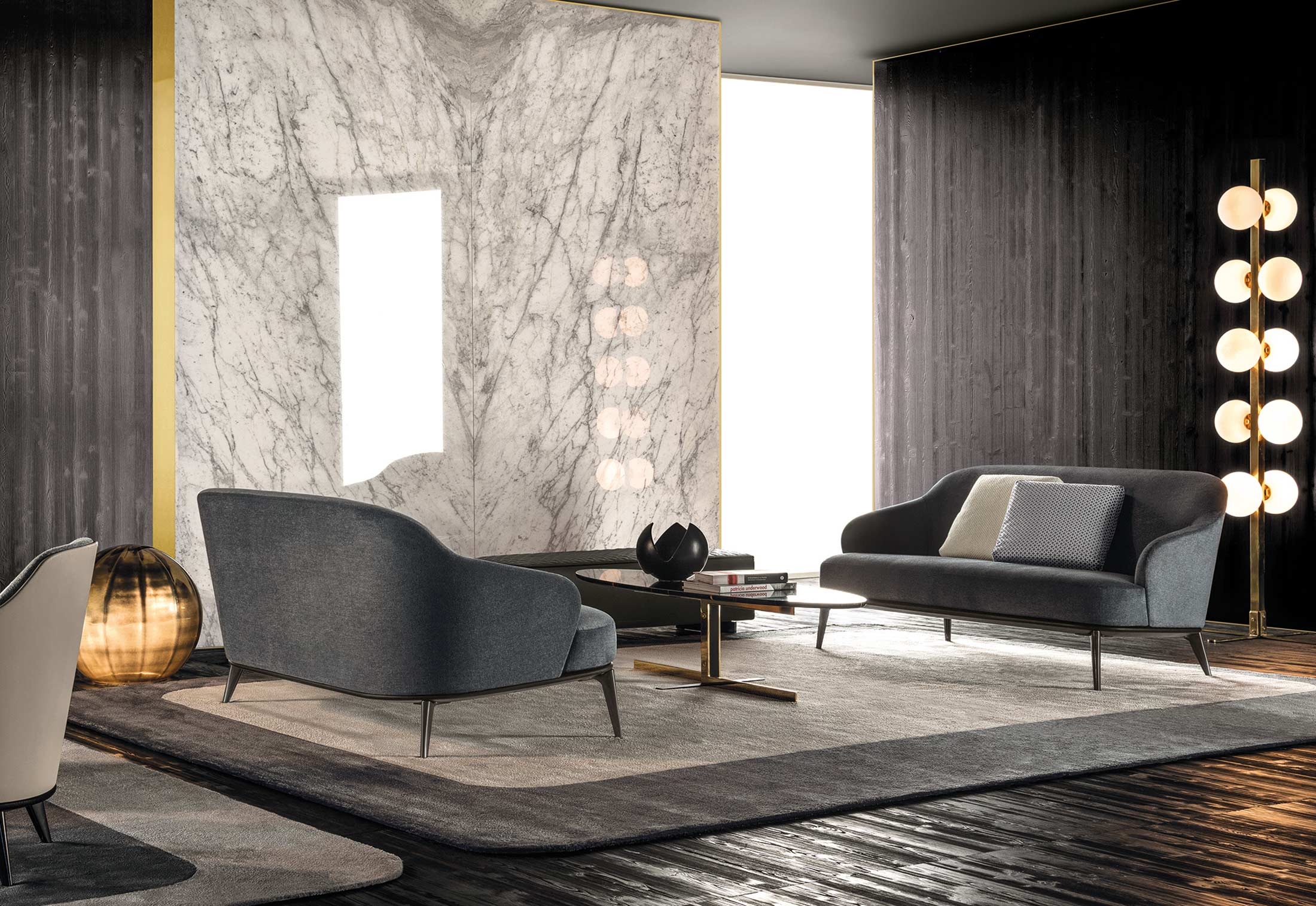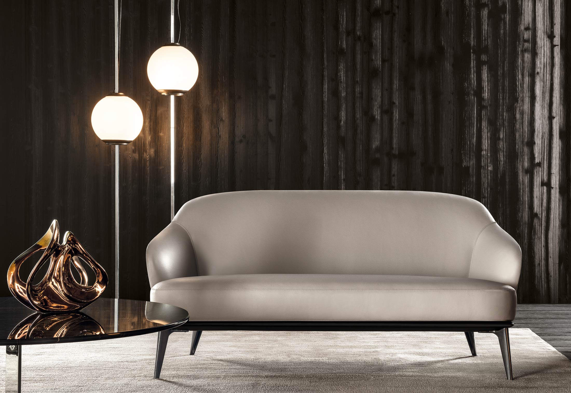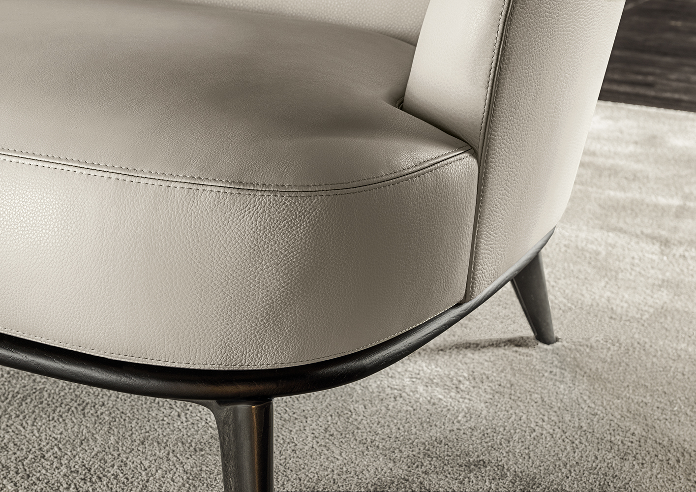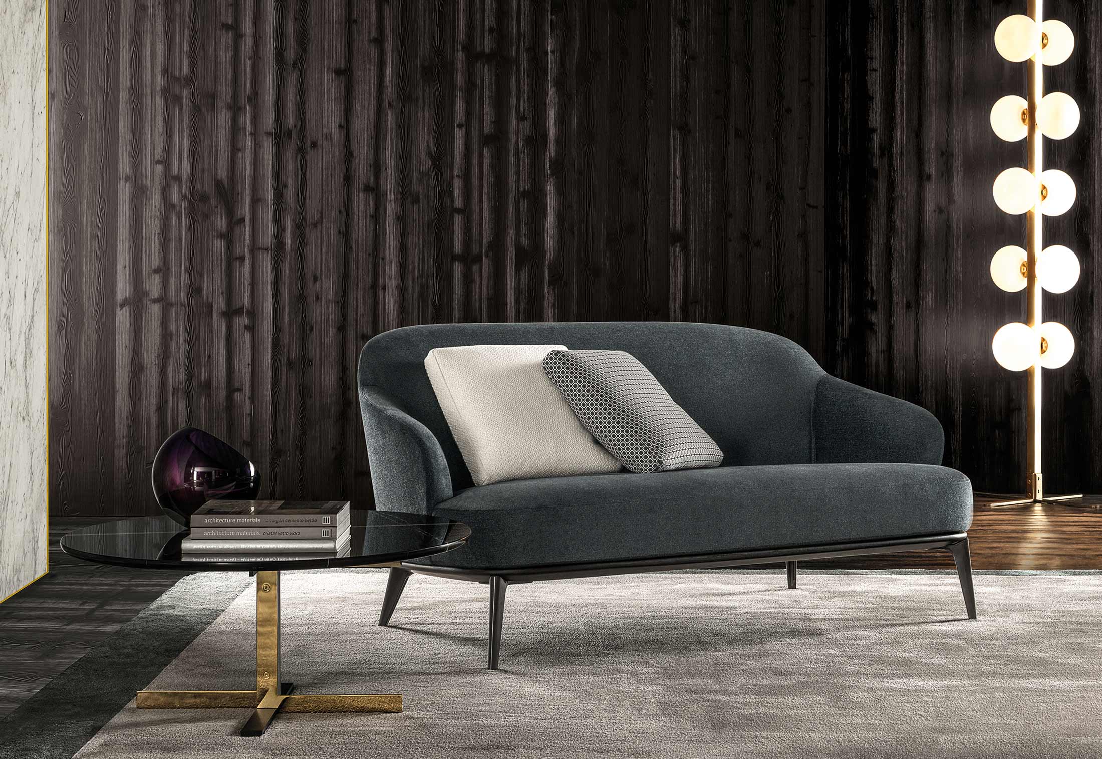 莱斯利沙发拥有轻盈的造型,精致的覆面展现出公司产品一贯的高超工艺。弧形的靠背采用记忆海绵填充材料,带来绝佳的舒适感。沙发构架为Moka色的开孔橡木实木。Leslie沙发的地面支撑脚为压铸铝,漆面为Pewter色。Leslie沙发的造型紧凑,不仅可以用于较小的居住空间,还可以用在接待场所,如休息厅、等候室、行政办公室,平添一份优雅的氛围。与其同名的扶手椅拥有多种外观组合,包括外部的皮革覆面以及内部的皮革或织布覆面,而Leslie沙发仅推出单一材料覆面的款型,也就是完全采用皮革覆面,或者完全采用织布覆面,可以在Minotti独家面料库不胜枚举的方案中尽情选择。