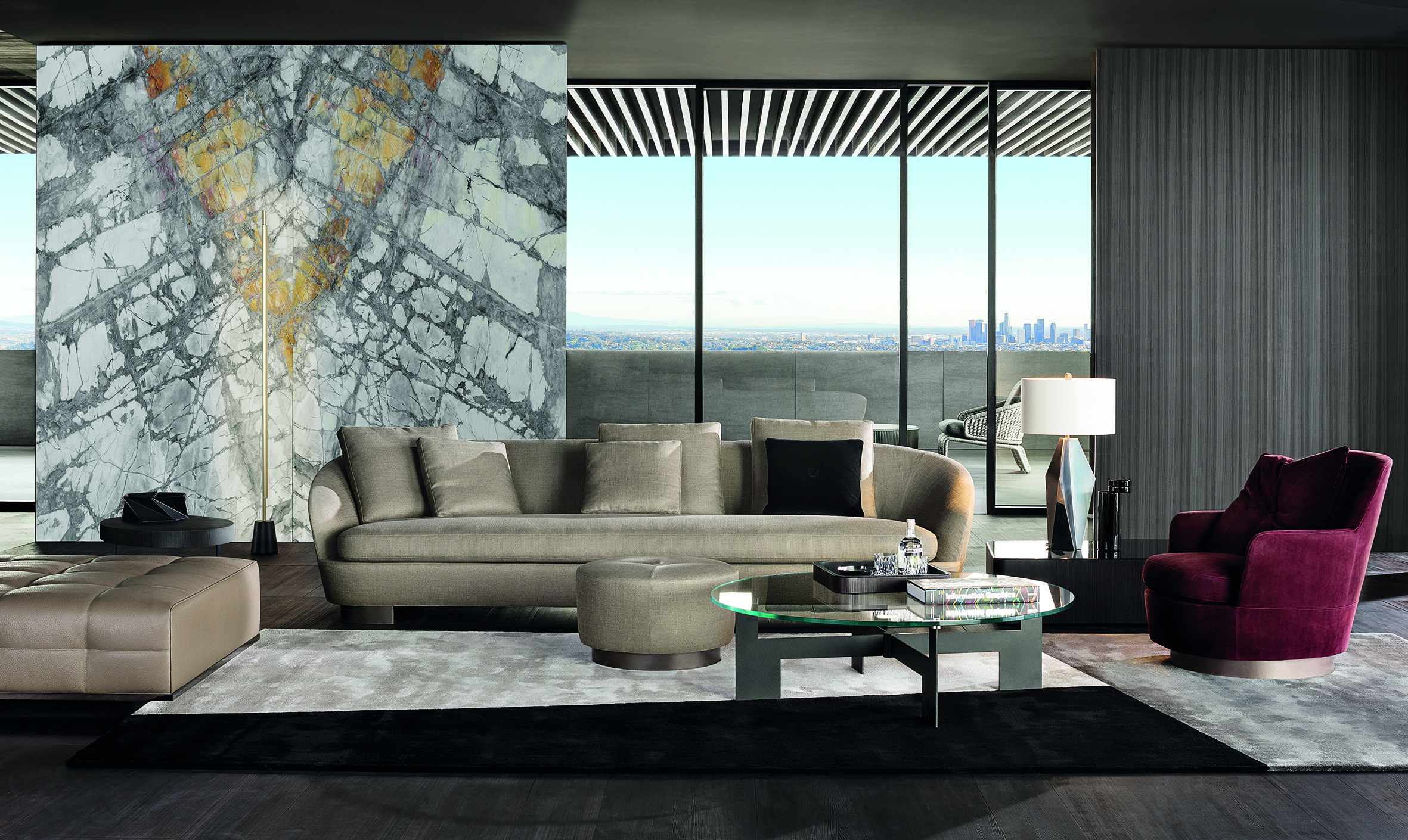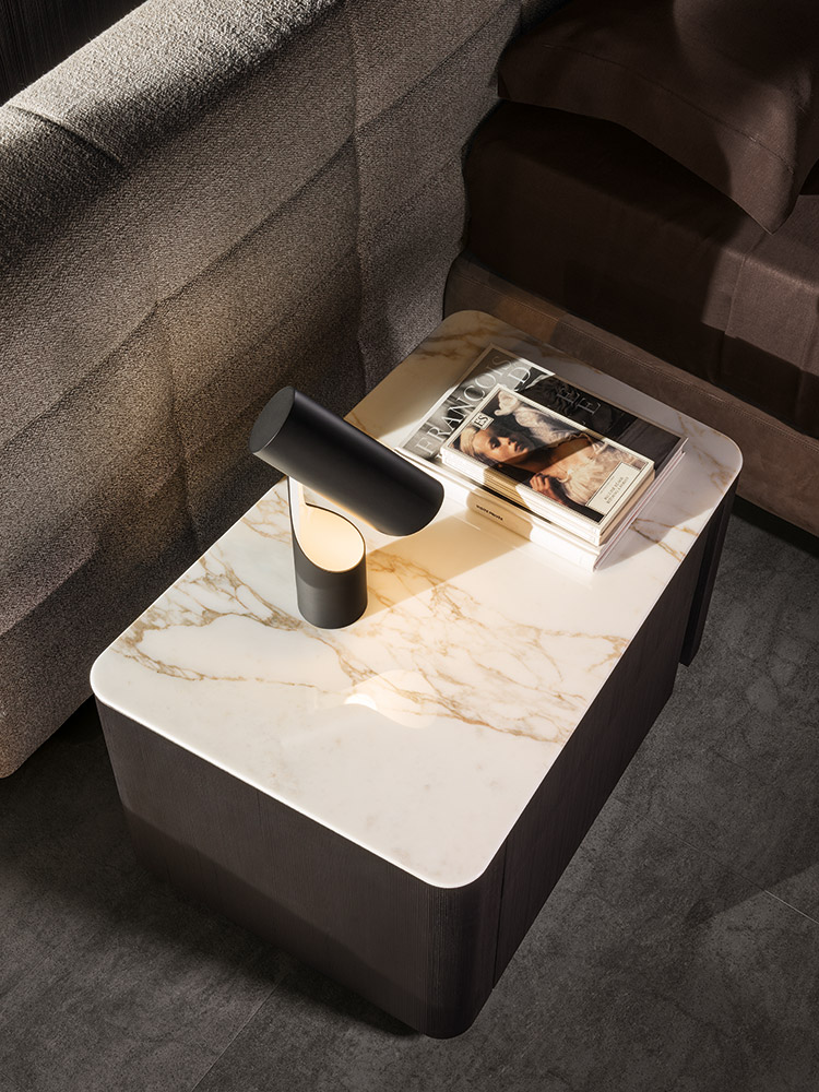 浅灰色与亮光灰褐色的落叶松木基座搭配不同材质的嵌装台面,打造出与众不同的对比效果:Calacatta大理石的华贵气质与玻璃釉的纵深感,配合木材的温润质感。 不同寻常的造型和迷人的材质组合为这款卧室家具配件平添一份独特的魅力,Lou系列所特有的美学图样也呈现其中。