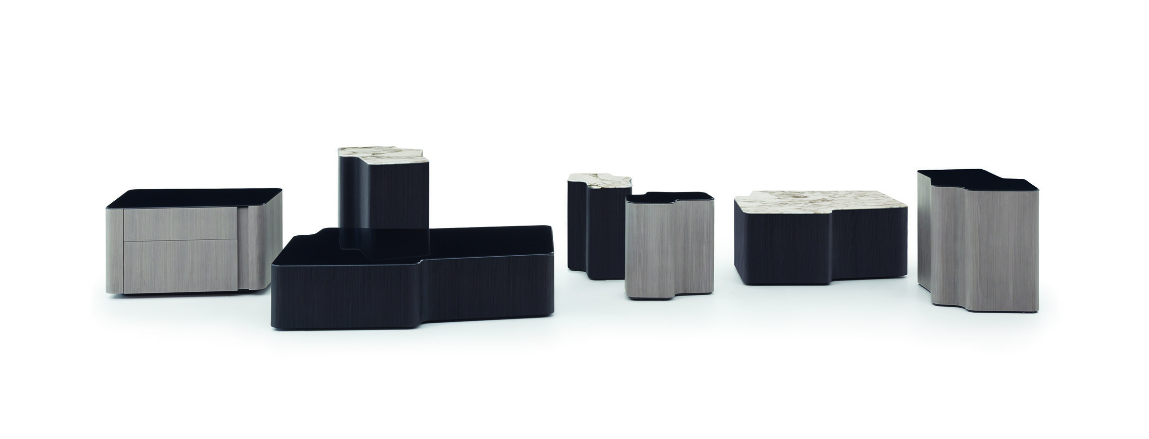 Lou边几组合拥有各种尺寸和饰面,呈现别具一格的家居风格。边几的做工极为繁琐,将现代技术与传统家具工艺完美结合在一起。内部结构为MDF材质,采用落叶松木胶合板饰面,然后在弯曲部分加以精心打磨。