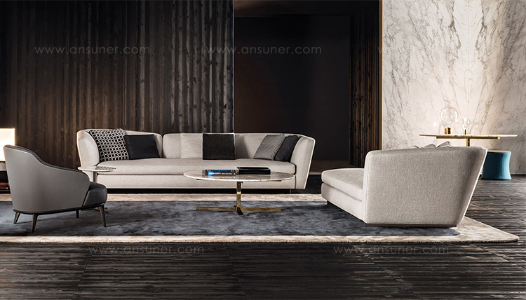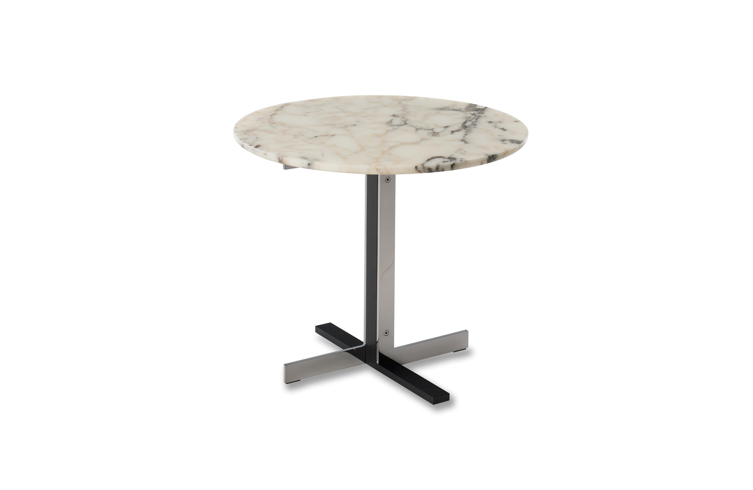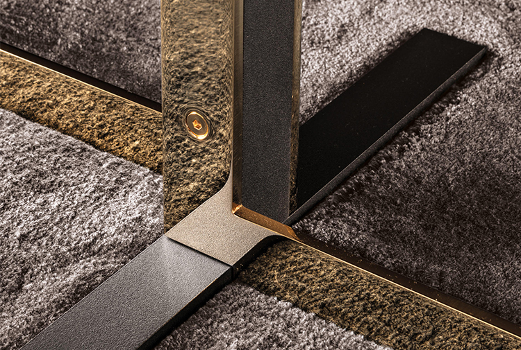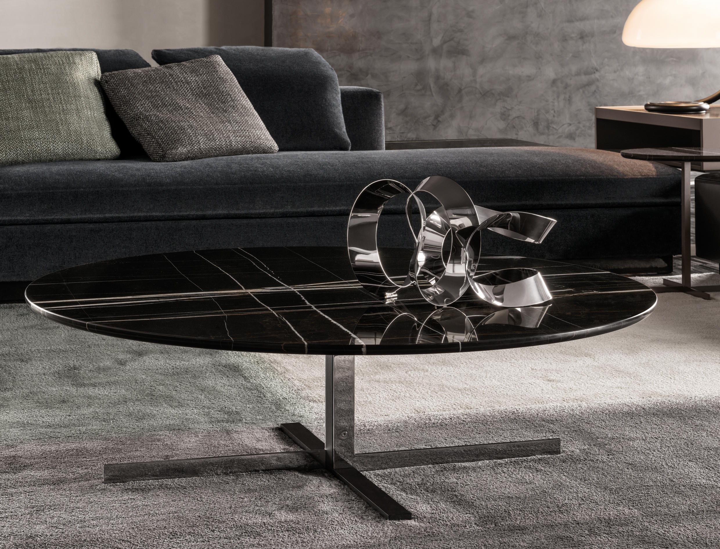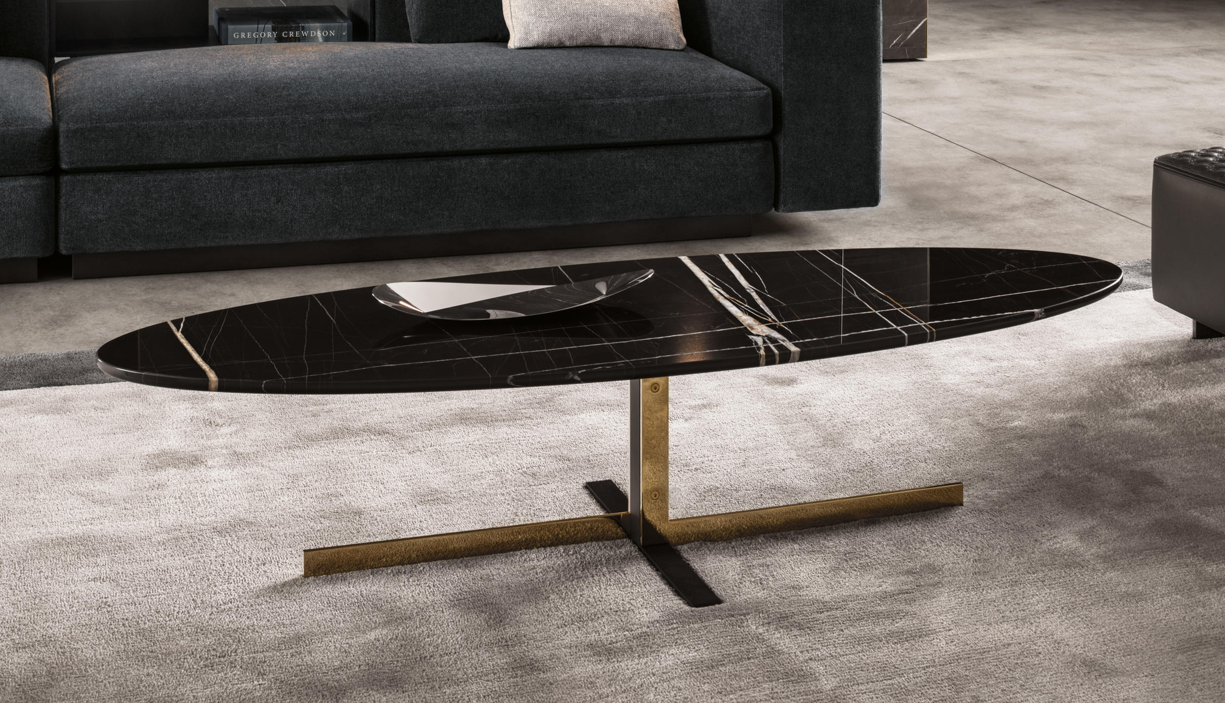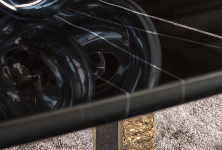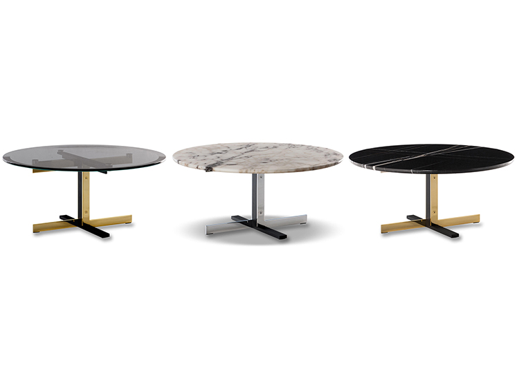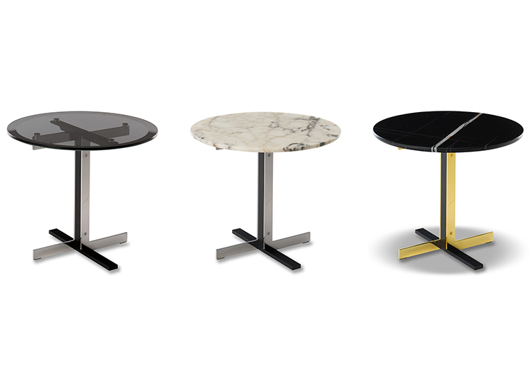这组边几系列简洁洗练,材质的选择展现出精致的典雅。如果说Catlin边几的设计崇尚简洁,那么材质的选择则旨在打造非凡的视觉和触觉效果。金属基座有着精致的十字形地面支撑腿,其中包括颇有趣味的组合:黑色压花搭配铬色或金色的抛光表面,打造出多种多样的风格。材料的搭配体现出非凡的优雅感,台面可以选择烟灰色的玻璃材质,或是选择两种珍稀名贵的大理石,Arabescato Purple或Sahara Noir,两者都拥有抛光表面。Catlin系列有圆形和椭圆形两种造型,有不同的尺寸可供选择,正如边柜和餐桌一样有多种类型。