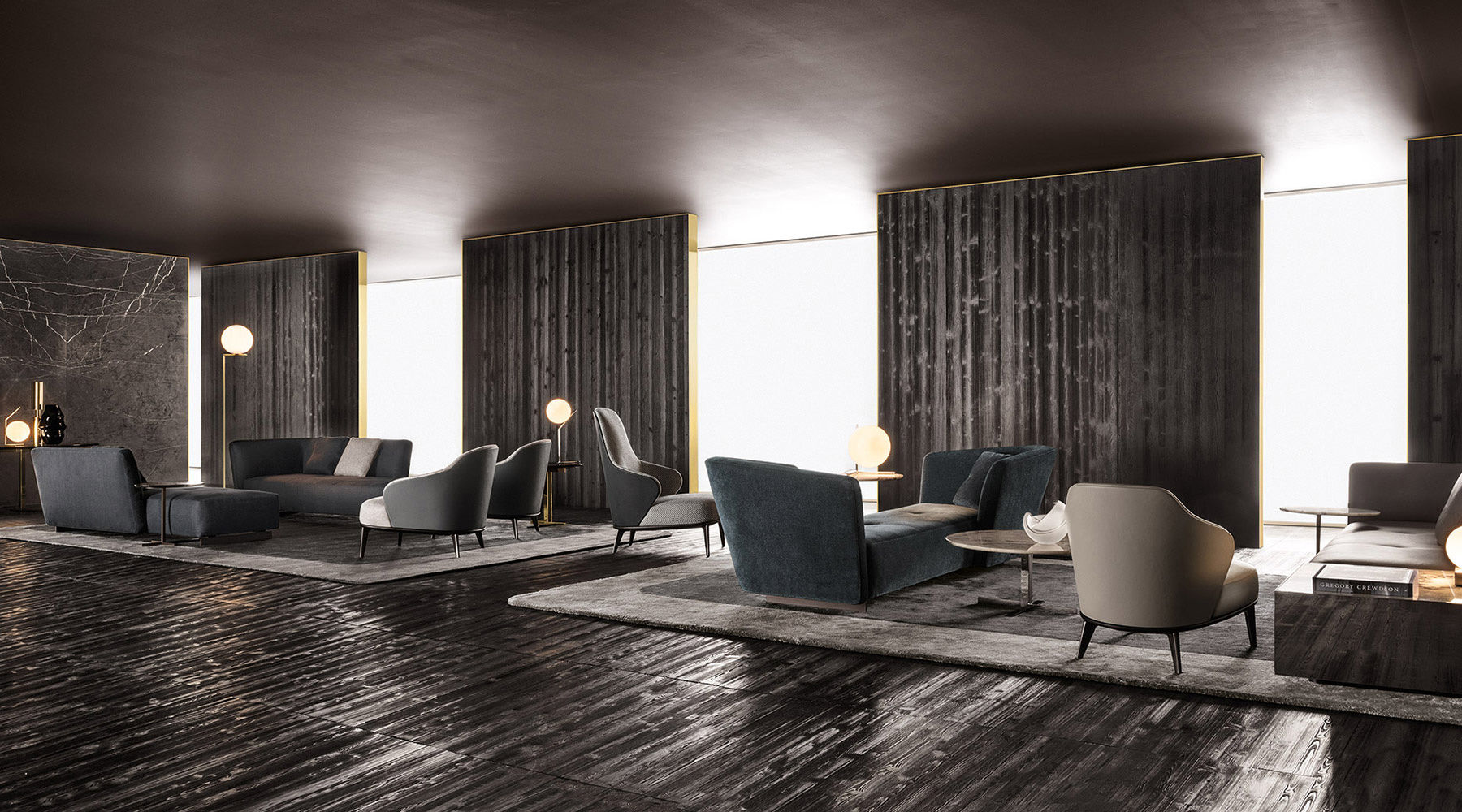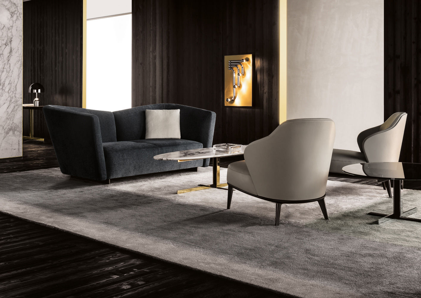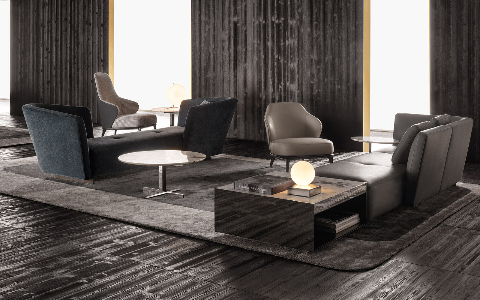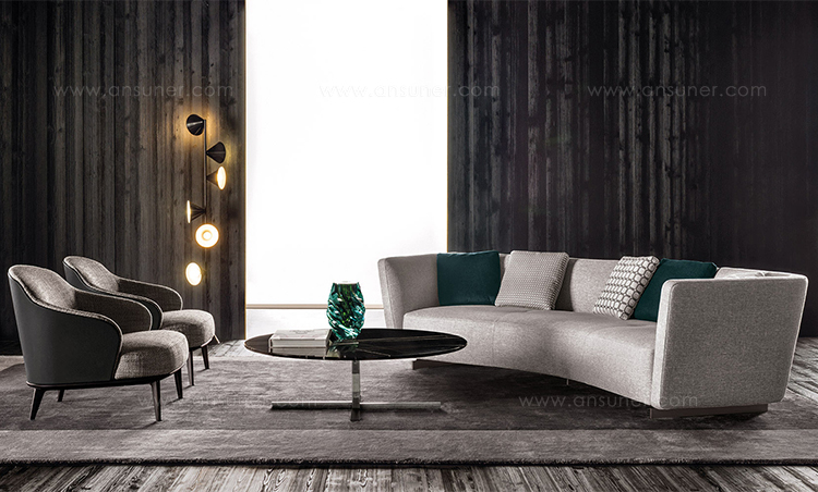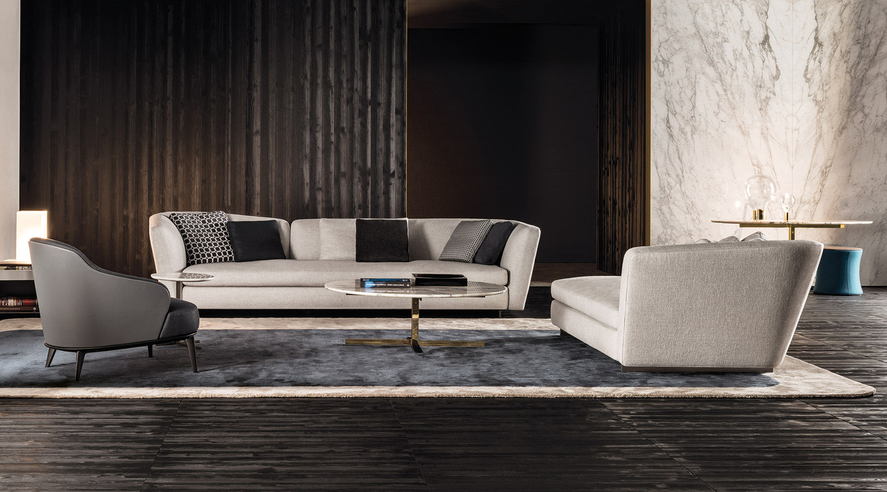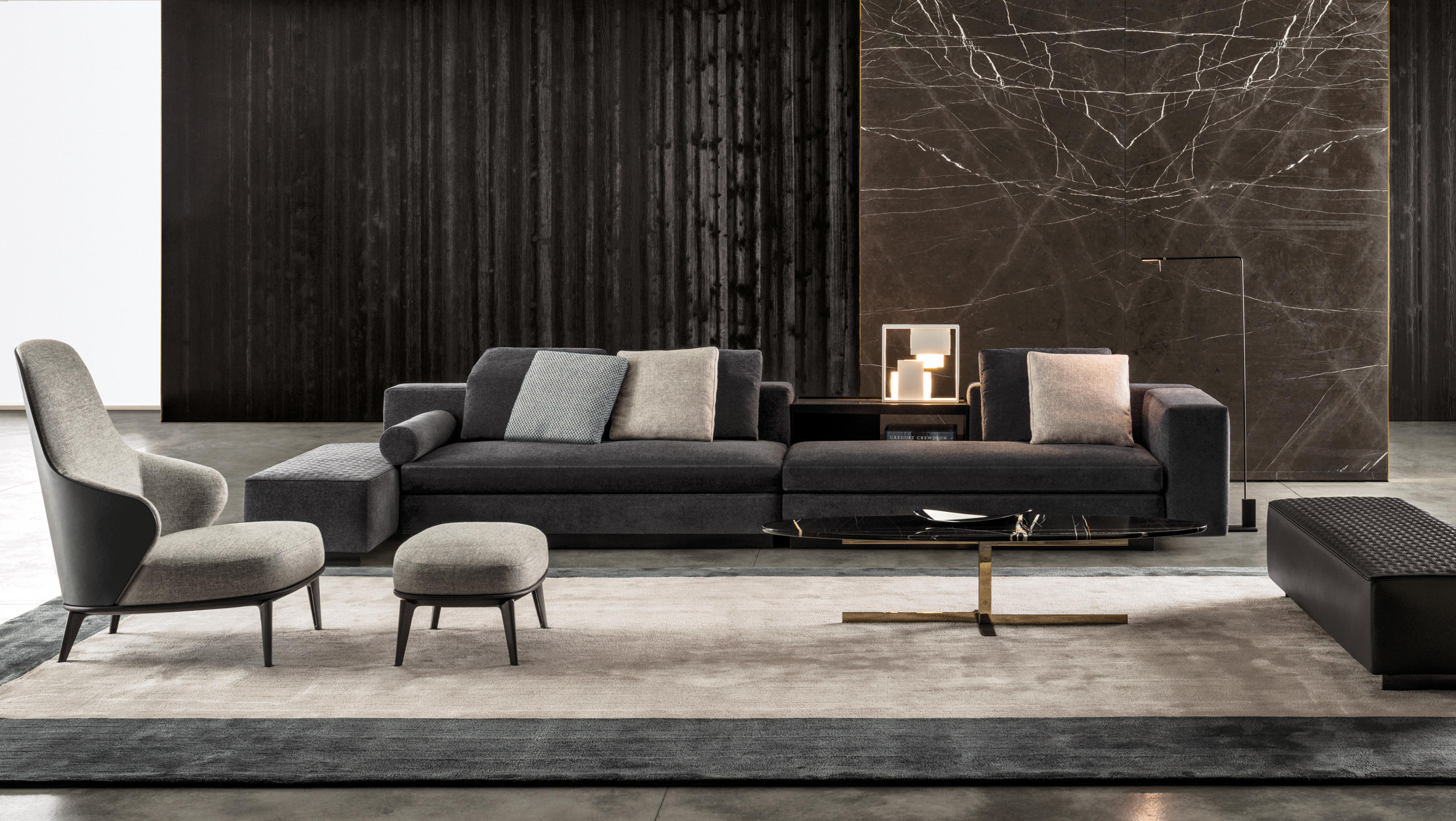 这组边几系列简洁洗练,材质的选择展现出精致的典雅。如果说Catlin边几的设计崇尚简洁,那么材质的选择则旨在打造非凡的视觉和触觉效果。金属基座有着精致的十字形地面支撑腿,其中包括颇有趣味的组合:黑色压花搭配铬色或金色的抛光表面,打造出多种多样的风格。材料的搭配体现出非凡的优雅感,台面可以选择烟灰色的玻璃材质,或是选择两种珍稀名贵的大理石,Arabescato Purple或Sahara Noir,两者都拥有抛光表面。Catlin系列有圆形和椭圆形两种造型,有不同的尺寸可供选择,正如边柜和餐桌一样有多种类型。