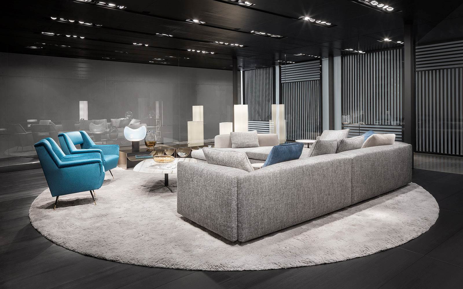 由于其纤细的结构,以及不同的高度和不同的顶部宽度,这张桌子看上去就像一根细线从地板上伸出来,沉入室内收藏的地毯的柔软纹理中。