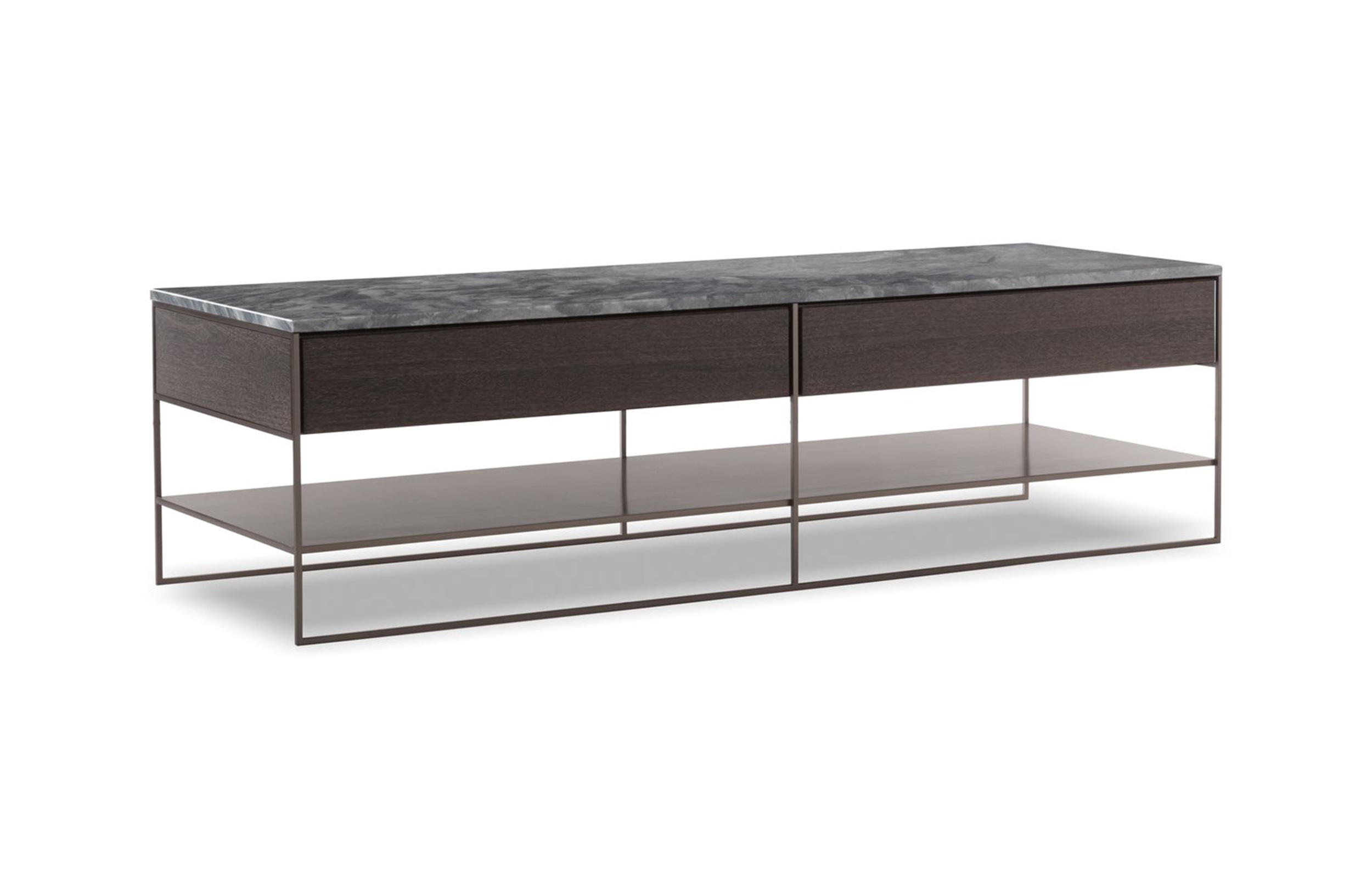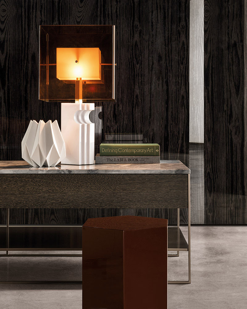 Calder家族有各种尺寸的边几和边桌,这一组全新的设计方案为其带来更为清新时尚的造型。铁架结构如今采用亚光浅铜色的表面。桌面也推出新版本:Sand色亮漆,米灰色的鲍迪豆木饰贴面,Bardiglio Nuvolato和Calacatta的大理石。中间层的桌面也为亚光浅铜漆面的金属。