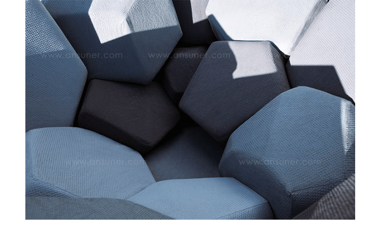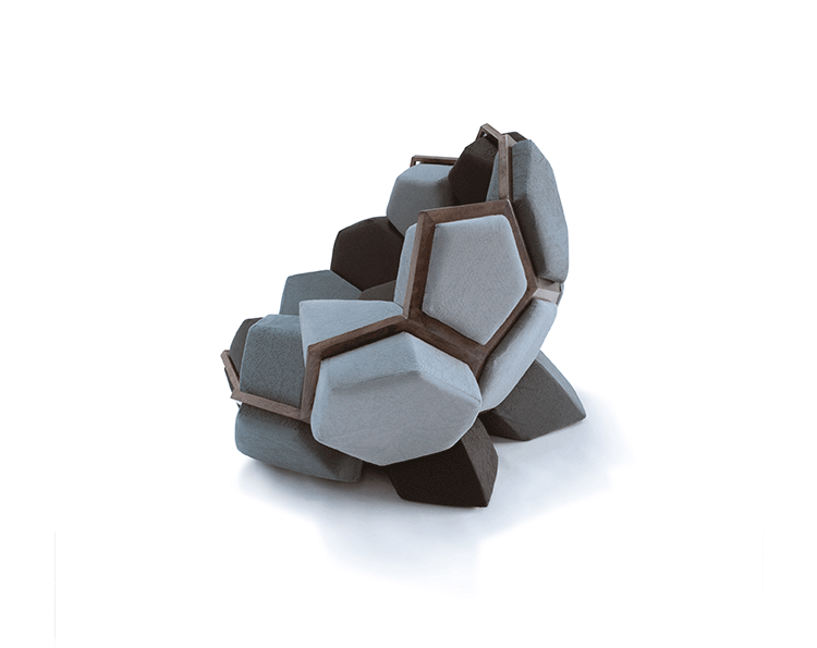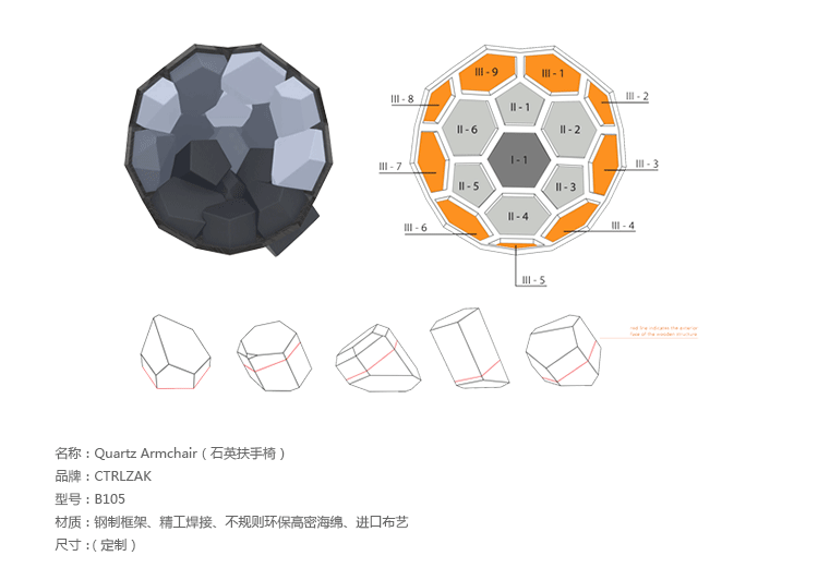 米兰的Ctrlzak设计工作室与Davide Barzaghi联手设计了一款几何风扶手椅Quartz(石英扶手椅)。很多创意的灵感都来自自然与几何结构的排列组合,Quartz就是其中典型的代表。它的整体结构由一个五边形和六边形的二位结构组成,就像钻石的结构那样,很自然的过度到一个三维结构。每一个五边形和六边形的组成部分都套上彩色环保面料做成的大小合宜的套子,所以这个几何风的扶手椅也别有一番野外的自然风情。该椅由十二面体的模块与带有六边形镂空图案的框架组成,而框架的整体结构则与天然结晶的形态相同。Quartz椅的各个软体模块表面由同一色系多种颜色的生态面料包覆,使其最终的外观看上去更像是自然界中的某种小生境,而非一把普通的座椅。比起座椅来,这款有趣的Quartz似乎更像是一件超大型的智力玩具——你必须把各个模块填放到合适的空格中去,在给你带来舒适的同时,也带来无尽趣味。