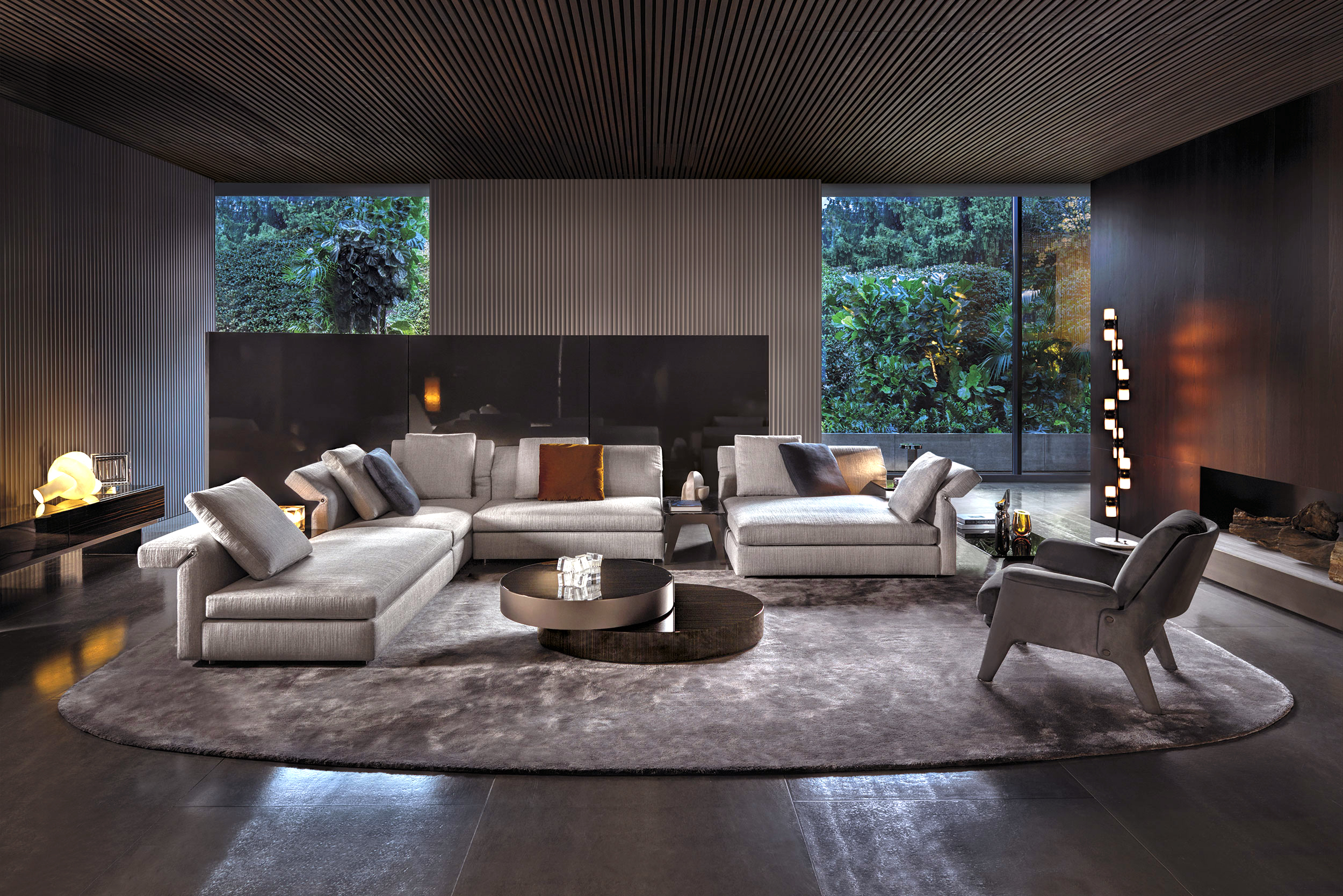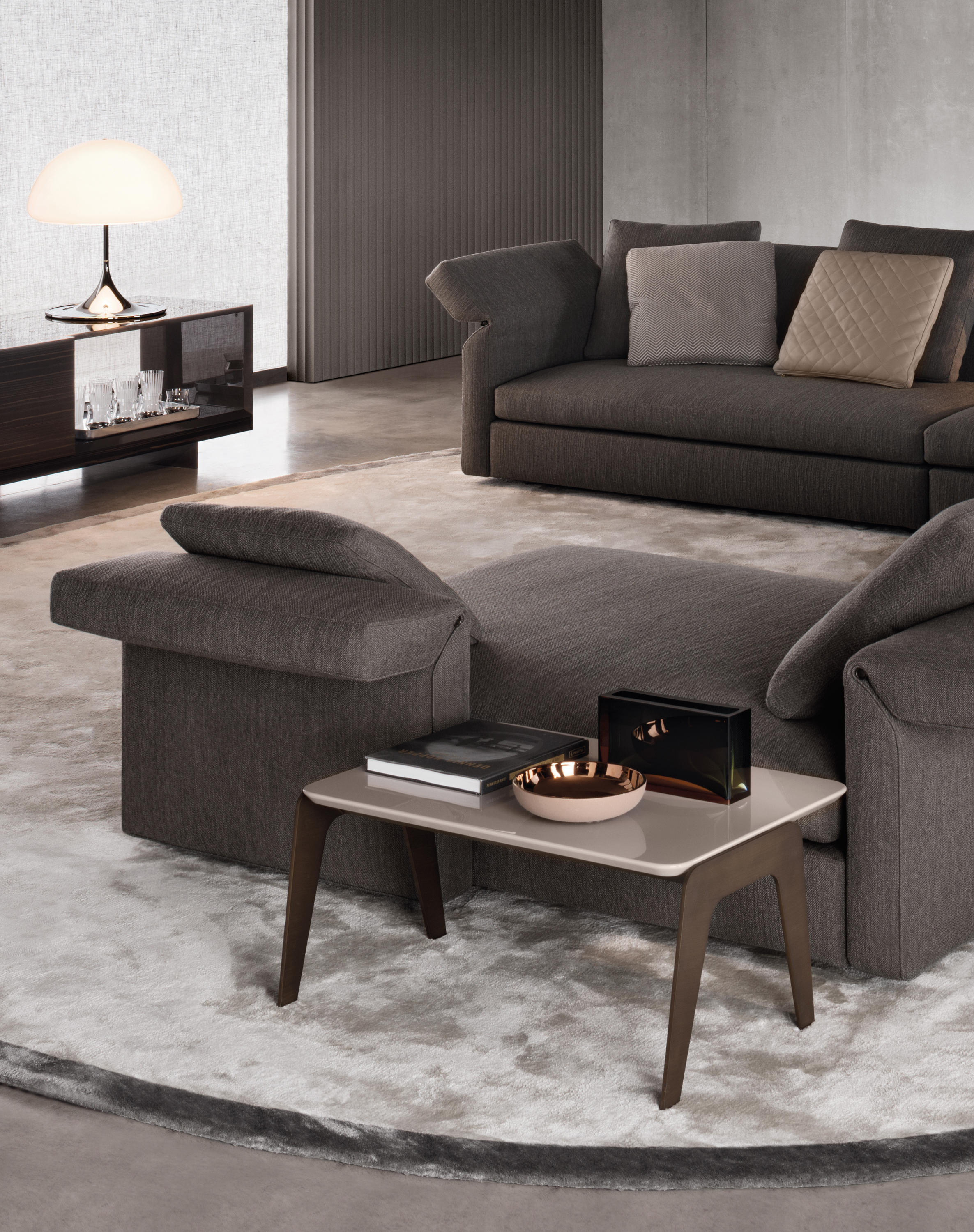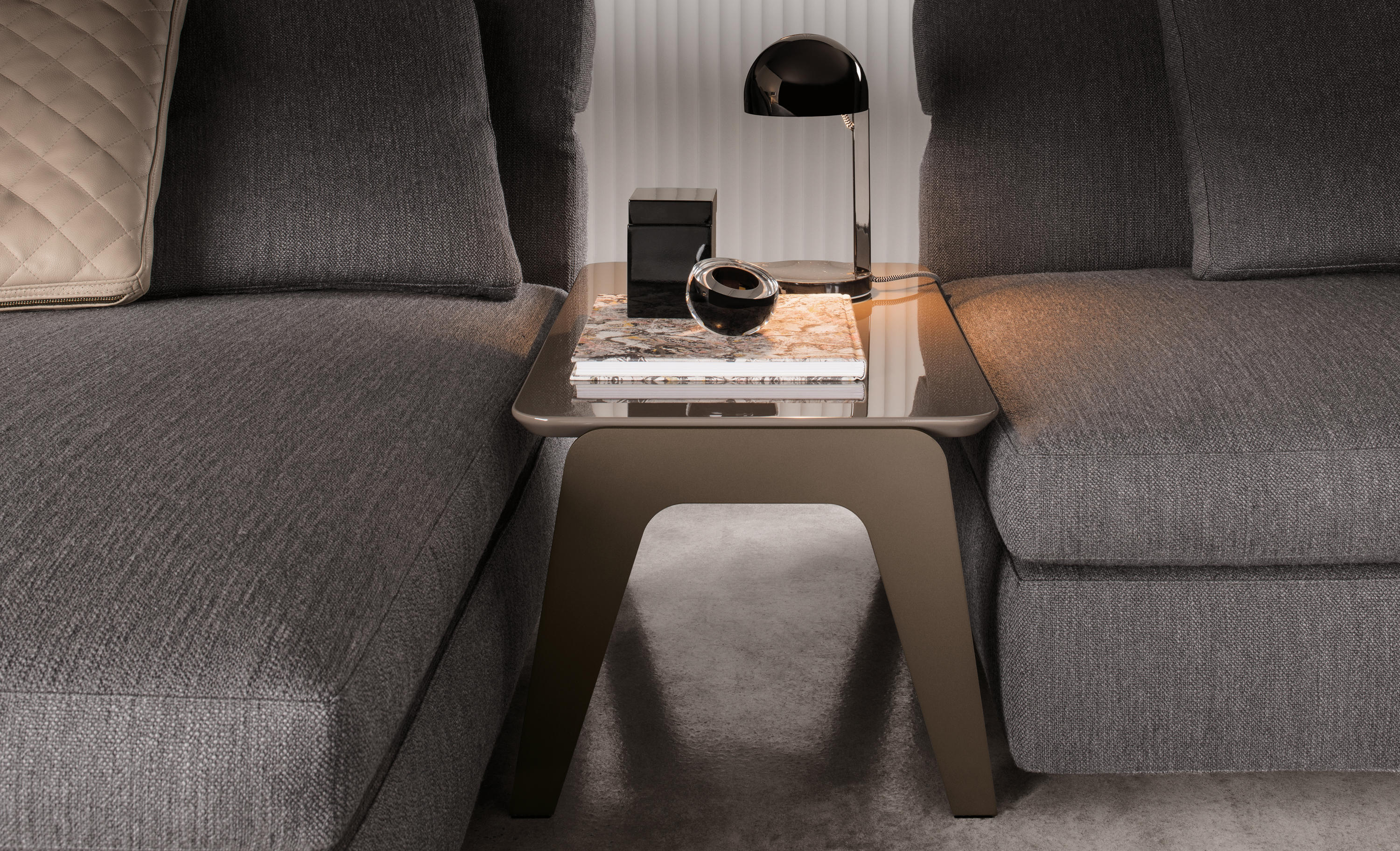 以精美梣木底座致敬传统黑檀木艺术,搭配拥有圆滑转角与柔和饰边的光泽漆面黑檀木、黑色脱蜡琉璃及 Marron Damasco 大理石台板。
