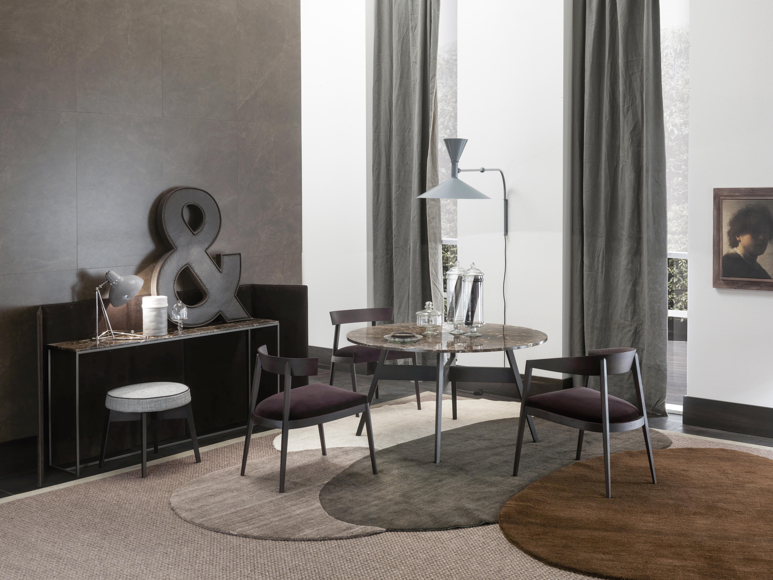 截锥形状特征的这把椅子是由特殊的耦合增强衬里的皮革和织物对比颜色深浅,模式和裁剪,座位和包裹起来的上层框架。 后者是几乎完全暴露,从而成为一个中心的整体组成、封面,还可以推出它完全删除了.