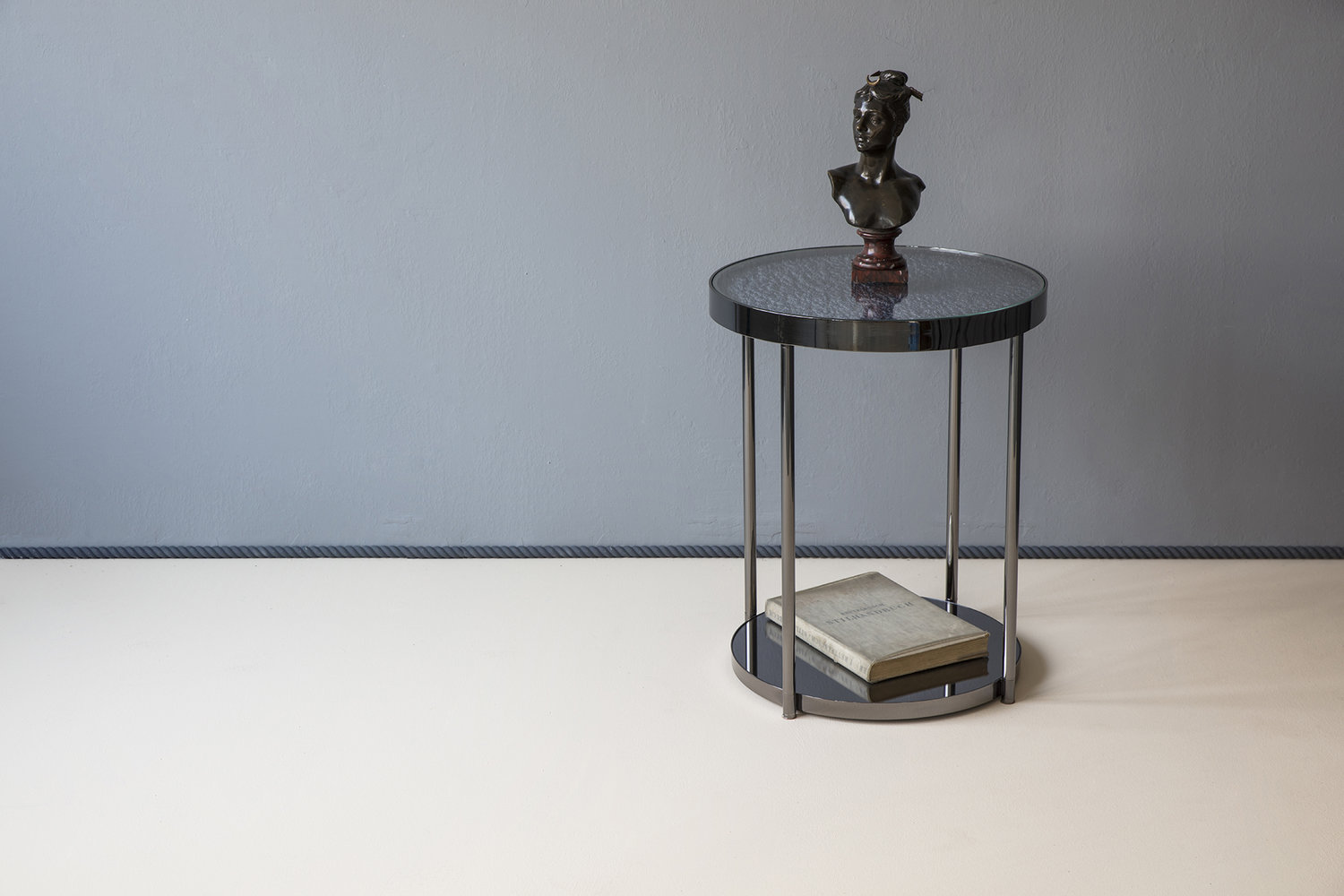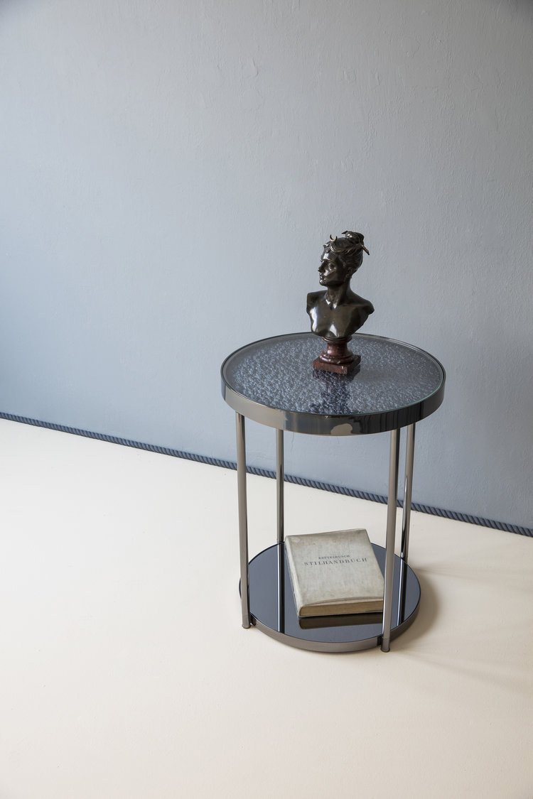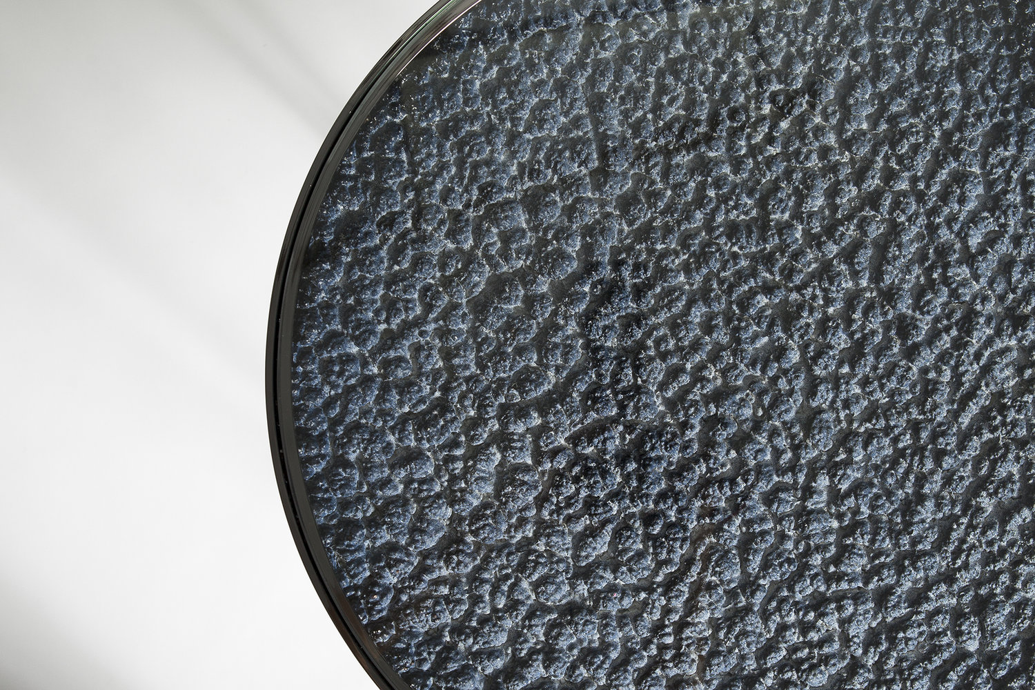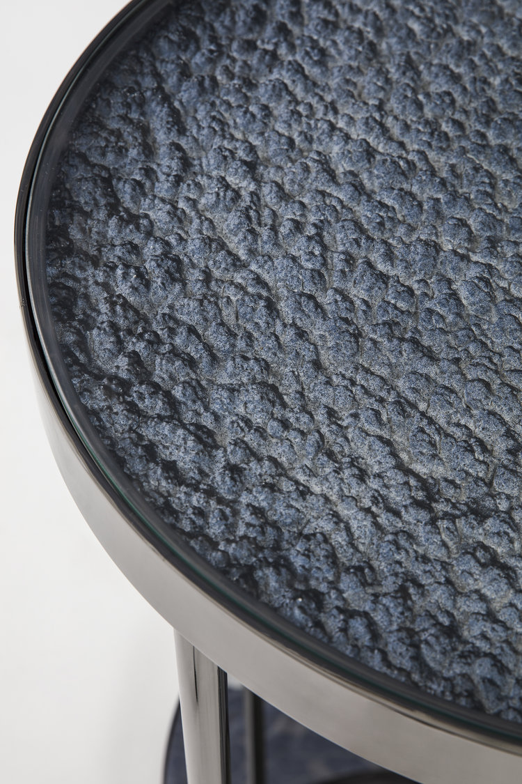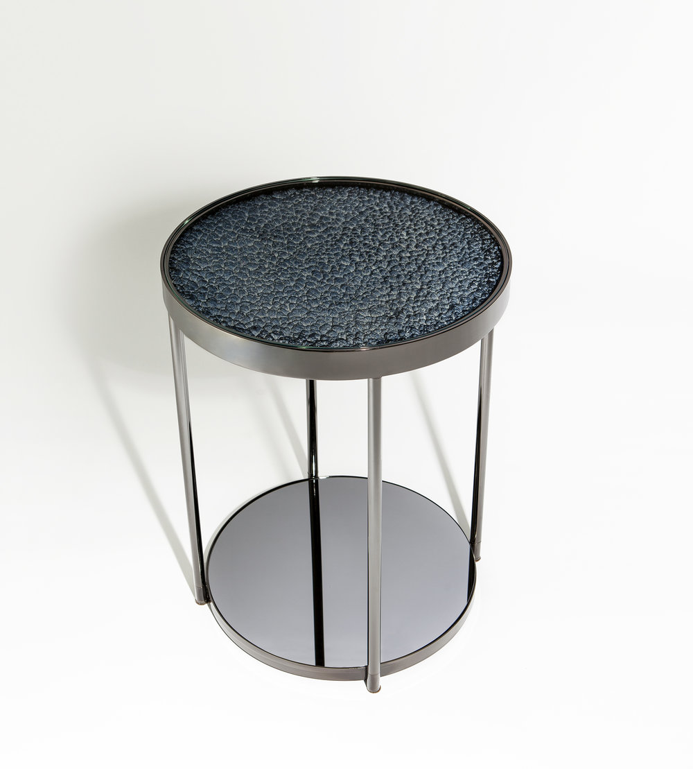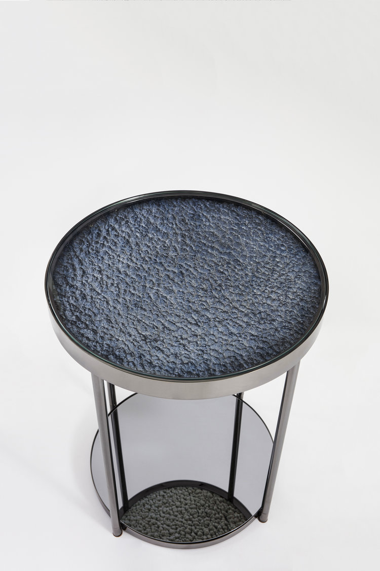 这款Hemlock设计的第二个版本具有更加男性化的感觉,抛光的黑色镍面和深色的镜面玻璃底。 月球状聚氨酯顶部采用靛蓝色调手工喷涂,以突出深度变化。原始白色顶部的照片固定在桌面的下侧,并在底座的镜子中反射。 这造成了同时看到白天和黑夜的错觉。