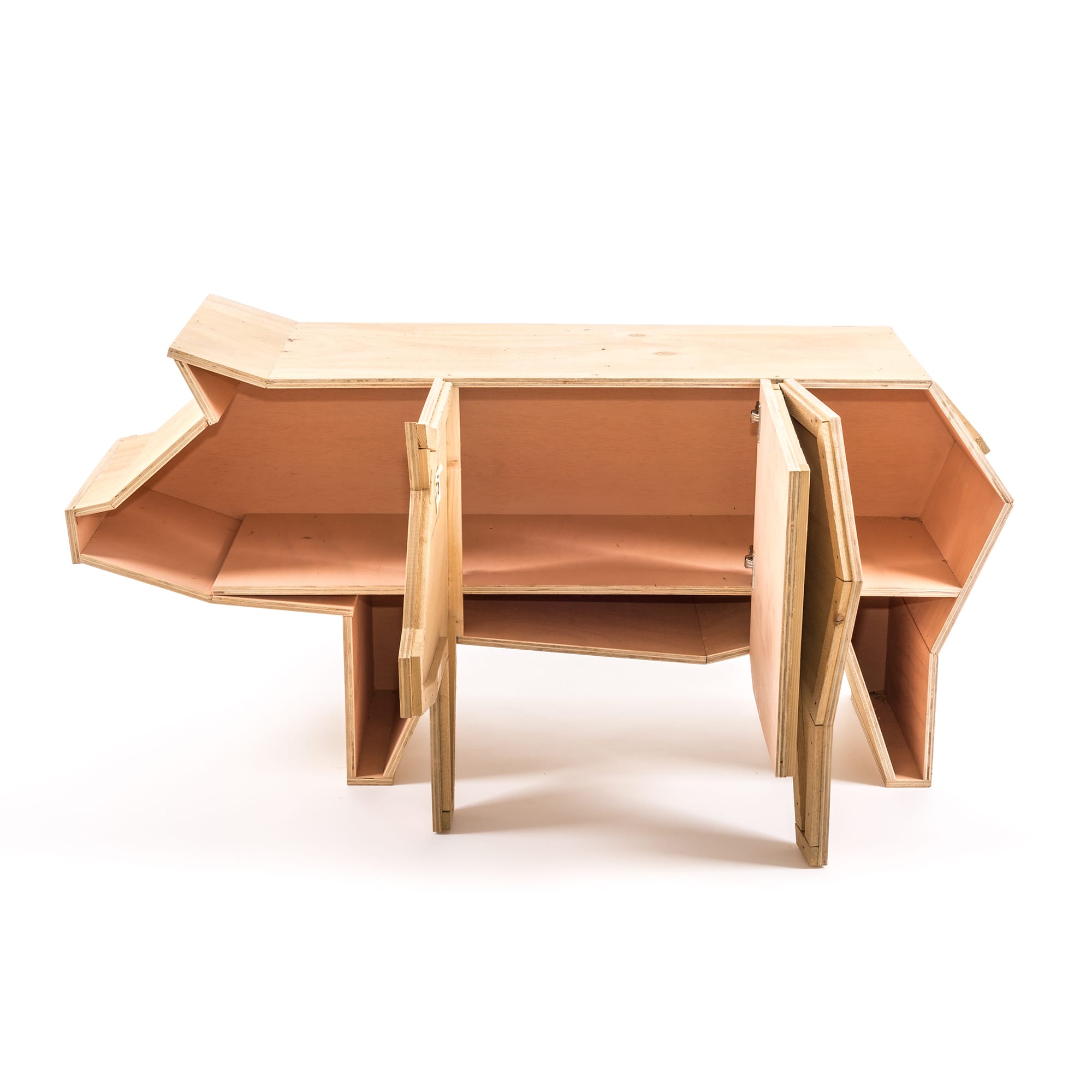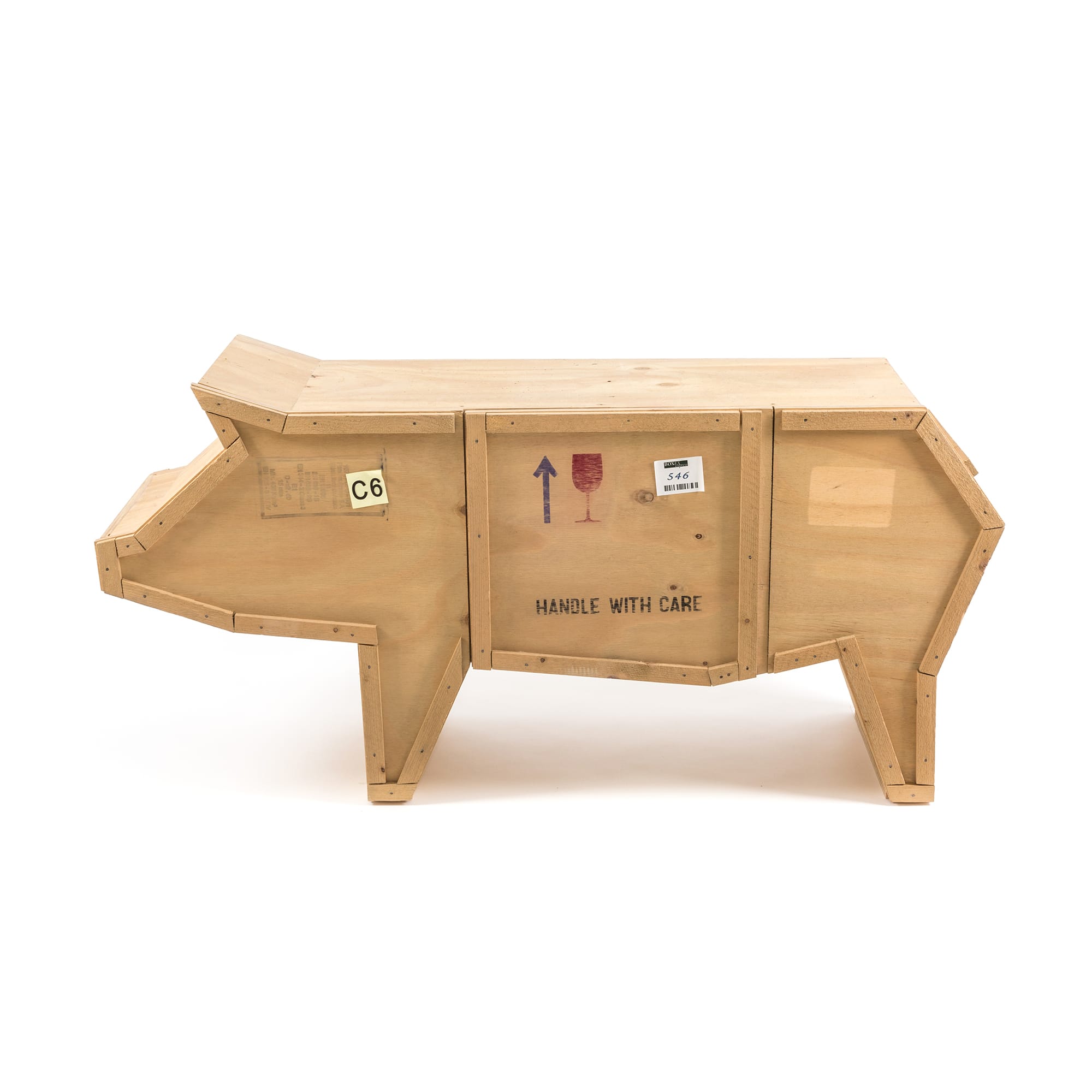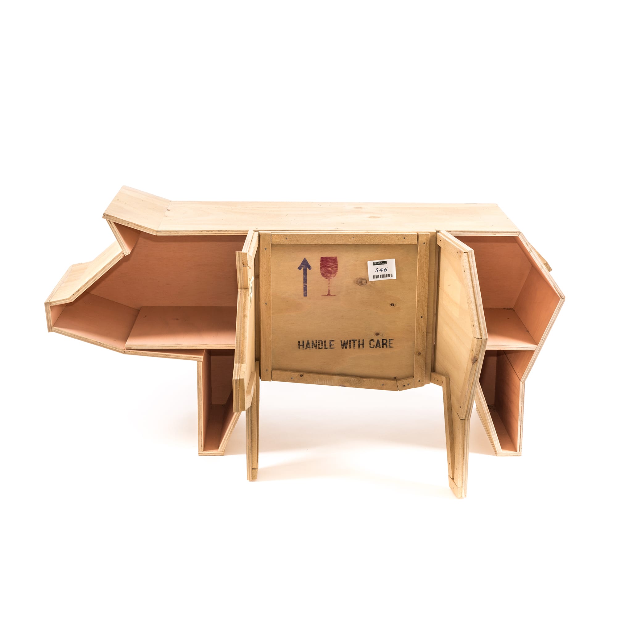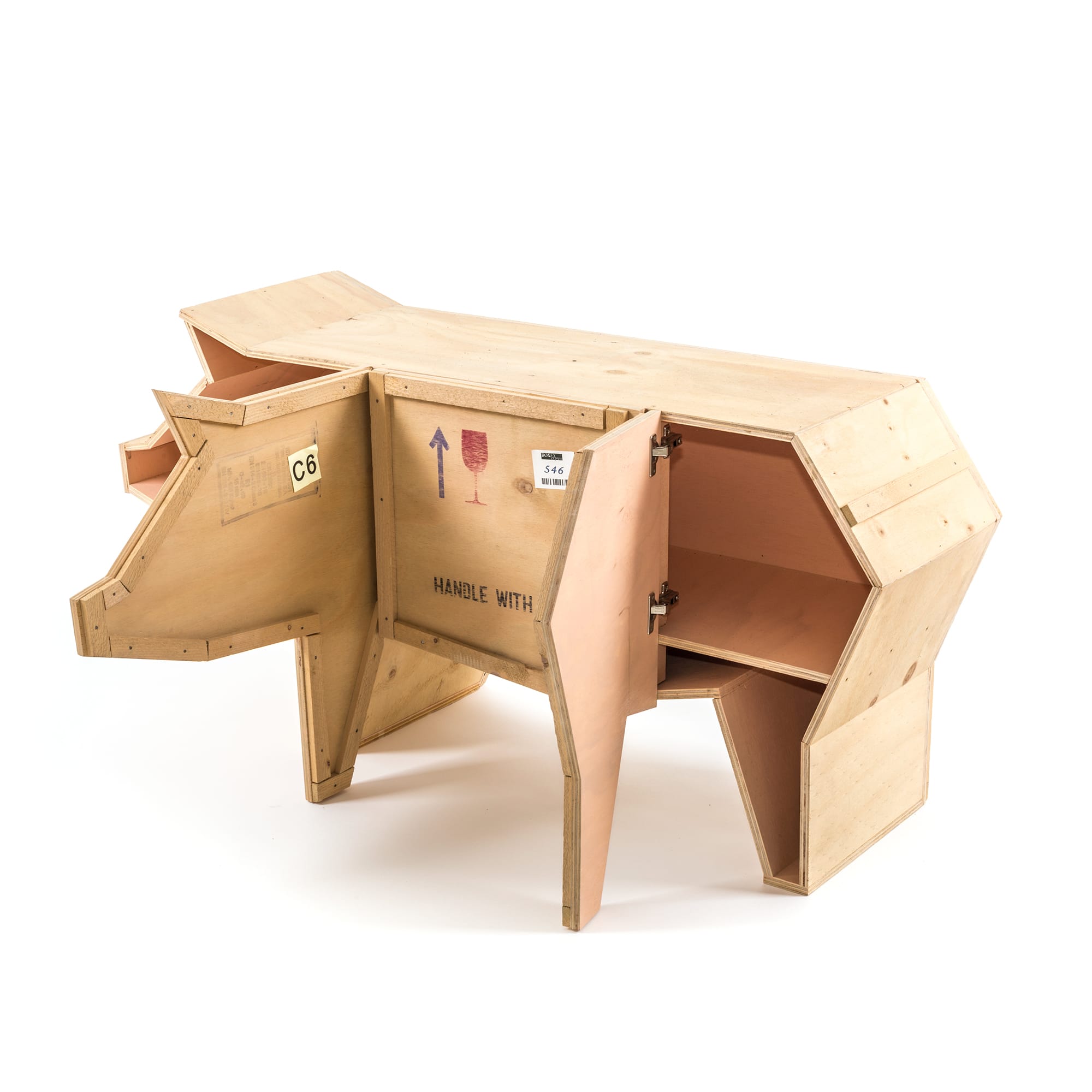 讽刺是一件严肃的事情,如果在微笑的同时让我们思考。动物板条箱协会很有趣,但同时也让我们对人类与自然的关系感到敏感。这件家具作品代表了一种荒谬的形象,动物们被运来运去。可能吗?为了更好地表达这个概念,我们选择了三种典型的农场动物,一头牛,一头猪和一只鸭子。每一个可见的瑕疵都是这件作品的特色,为了尊重原作的诗意,这些作品都是用同样的工艺制作而成,用于真正的运输板条箱。
