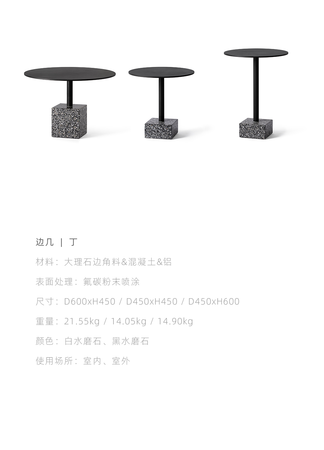 水磨石边几 全铝金属桌面不生锈,耐候粉末喷涂抗紫外线耐候不变色,致密表面防油污,室内户外通用。 全铝精密加工,部件均可拆卸,减少包装体积,降低运输成本。 回收石材边角料,与混凝土混合后打磨,形成经典的水磨石质感,呈现透气自然的机理,是旧时光的记忆。 简约黑白的经典搭配,致密的材料应用,便于清洁维护,适应户外、室内各类风格的公共区域。