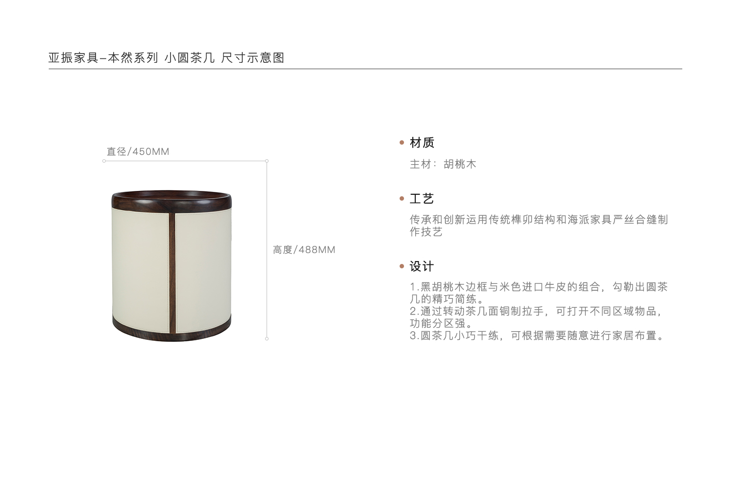 1.黑胡桃木边框与米色进口牛皮的组合,勾勒出圆茶几的精巧简练。 2.通过转动茶几面铜制拉手,可打开不同区域物品,功能分区强。 3.圆茶几小巧干练,可根据需要随意进行家居布置。