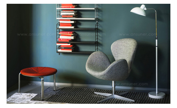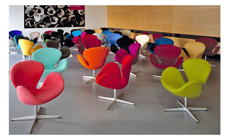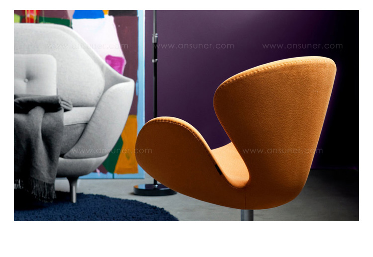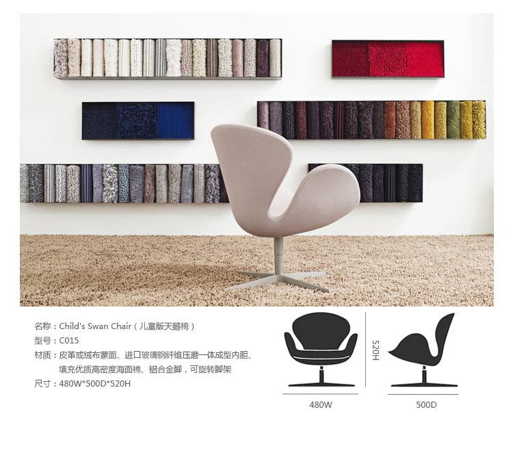 天鹅椅于1958年由丹麦设计师Arne Jacobsen所设计,因其外观宛如一个静态的天鹅而得名。作为一款现代家具设计中经久不衰的经典作品,天鹅椅以其优雅的造型和简约的设计一直为追求时尚的人们所情有独钟。被认为最有代表性的北欧设计,也是世界艺术的珍品。此款为天鹅椅的儿童版,为原版的缩小版,适合儿童依座,命名为Child's Swan Chair(儿童版天鹅椅)。天鹅椅内部是钢材质,由模具出模成型,坚固的材质,不会变形、不会开裂,完美的质量让您放心使用。表面是进品真皮(可选用羊毛绒布或其它皮种),整个产品表面光滑,不起皱。针缝直而顺且流畅。线条优美、缝线美观、均匀自然。皮裁直顺,皮管粗细均匀。整个椅子的布或皮下面都有垫弹性海绵,耐坐不变形。不仅外观圆滑且更富有弹性,让坐感更加舒适。铝合金(或不锈钢)四星脚,每个细节都顺畅无坑洼,光滑不留痕迹。椅脚都可360度旋转,如天鹅般外形独特,具有个性的设计作品,加上精心设计的椅脑与扶手,两边对称相应,坐上去舒适、优雅而大方。