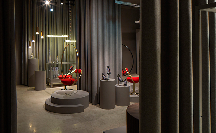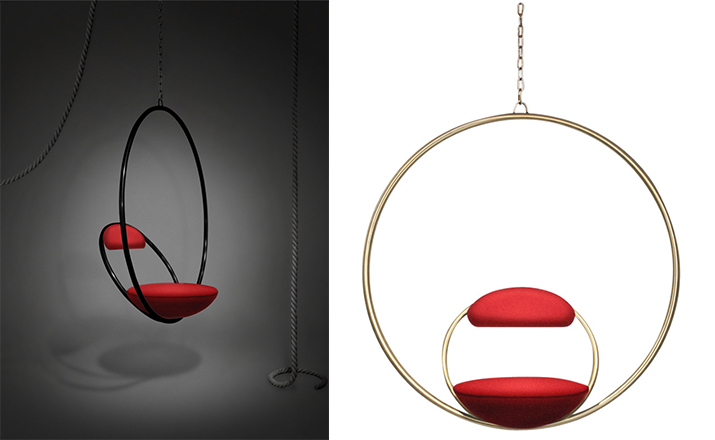 "Suspended from above,two brass plated steel circular hoops join to create the Hanging Hoop Chair,with a seat and backrest upholstered in Kvadrat wool.Also available in a satin black finish."