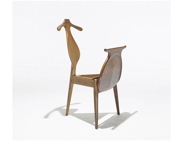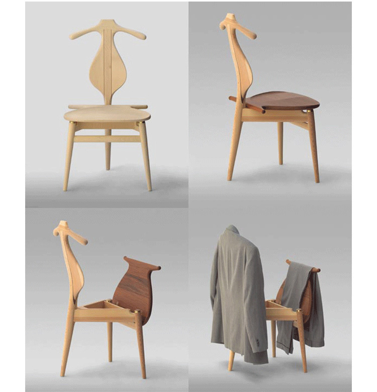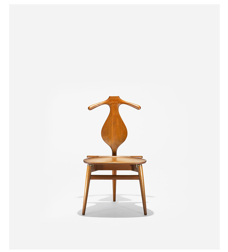 The Valet Chair(侍从椅),1953年设计,是Hans J. Wegner的经典代表作之一。这把椅子是Hans J. Wegner同建筑师 Steen Eiler Rasmussen 和设计师 Bo Bojesen 聊天谈到就寝时折叠衣服的麻烦,他就做了这个有趣的设计,为了让它看起来不笨重,从4条腿减到3条。靠背两侧选用对称的木纹,木纹的机理是整个靠背有机曲线的补充。椅子看起来像一把提琴,又像一个穿着燕尾服的侍从,不但具有美感,而且很具实用性。