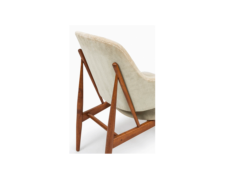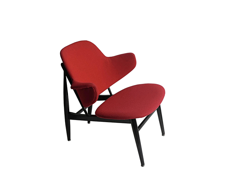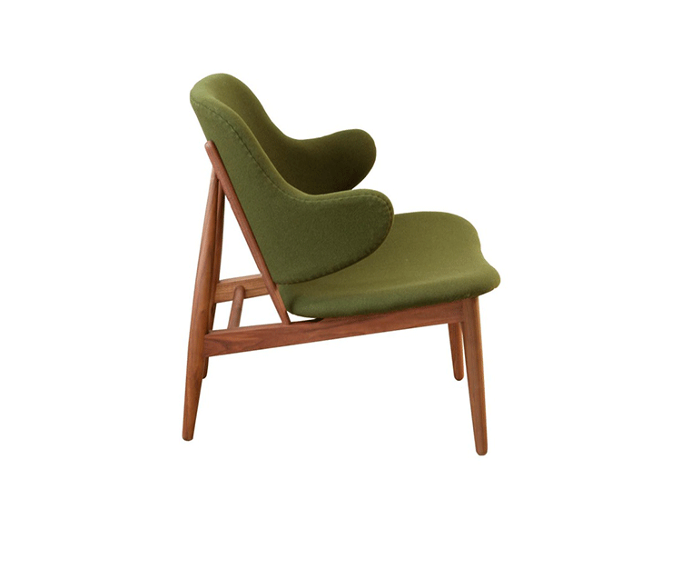 "IB Kofod Larsen设计的这款椅子来源于1950年以及早期由Christiansen and Larsen设计的桦木框架版本,这一款加上了来自Fanny Aronsen的 Kvadrat Balder面料。椅子做工精良,配以铜绿色的框架。"