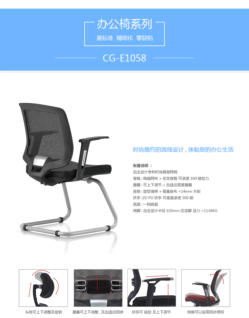 CG-E1057办公椅是一款符合人体工学的全功能性办公椅,力求使用者能充分理解其人性化的设计及达到最舒适的调节。