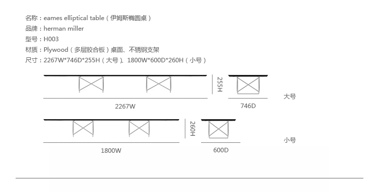 Charles和Ray Eames 夫妇在1951 年设计大型桌子时考虑过很多种形状,但是他们最终选择了椭圆形。这让人很容易联想到冲浪板。这也和Eames 夫妇住在位于加利福尼亚州、太平洋边的公寓和工作室有关,从这里可以眺望到他们喜爱的大海。Eames 椭圆桌的特点是低和长,可以放在长沙发或几张椅子前面,非常舒适。您可以将它放在卧室、会客室或是办公休息室,在宽敞的、不拘一格的桌面上,陈列精美的艺术品、新鲜的花、杂志或是专业书籍。"