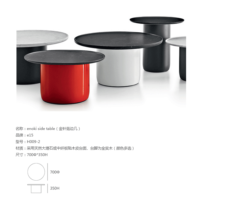 金针菇边几是2011年由 Philipp Mainzer 设计的。金针菇是一个通用的边几,由大理石、 实木组合和可用彩色钢。金针菇是有两种不同的直径和高度,边几面板厚30毫米。大理石亚光油着色,环保自然。为了避免刮伤的地板,边桌配备毡圈两件。
