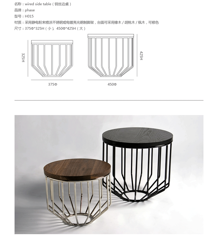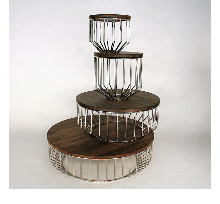 Blending sloping angles and taut lengths of bent metal are a modern interpretation of the wiry idea initially conceived by Warren Platner.The series is made up of a suite of wire tables,side tables and benches and fitted with luxurious solid wood tops.