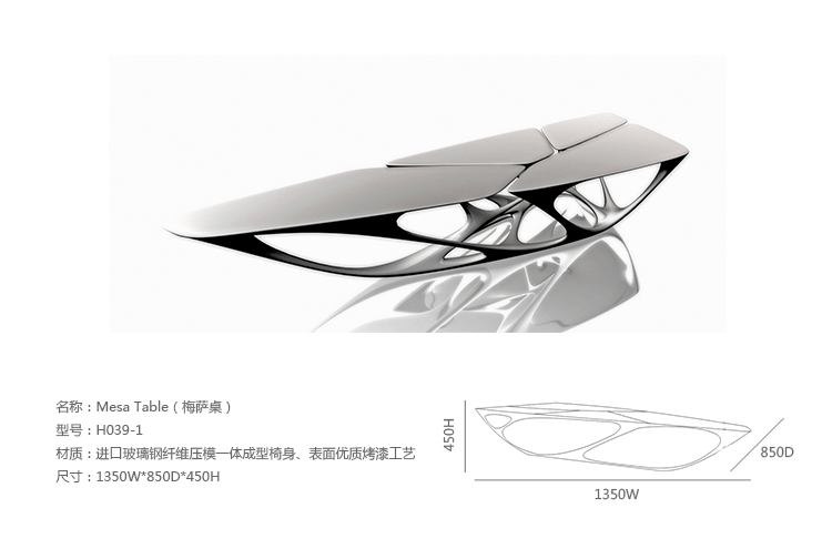 Zaha Hadid(扎哈·哈迪德)不仅是一位世界闻名的伟大建筑设计师,同时她在家具设计界的成就丝毫不逊于她在建筑领域的成就。2004年度这位伊拉克裔英国女建筑师以设计中国台湾台中古根汉美术馆而荣获建筑界最高荣誉普利兹克奖,是首位获此殊荣的女性建筑师。53岁的她,也是最年轻的获得者之一。她设计的这款Mesa Table(梅萨桌)以流体的空间造型,混合革命性的美学构建主义,让人叹为观止,座子就像一只宇宙飞船,剥离地面、 结构、 表面,创造一个“二元次”平面,这已经成为结构但空洞像固体一样表达形式。当一端被上无形的引力所吸引,它倾斜的对称性、 船头拖而下方伸展运动弹性来容纳扭曲的结构以及它的其他形式。桌子采用进口玻璃钢纤维压模一体成型椅身、表面优质烤漆。