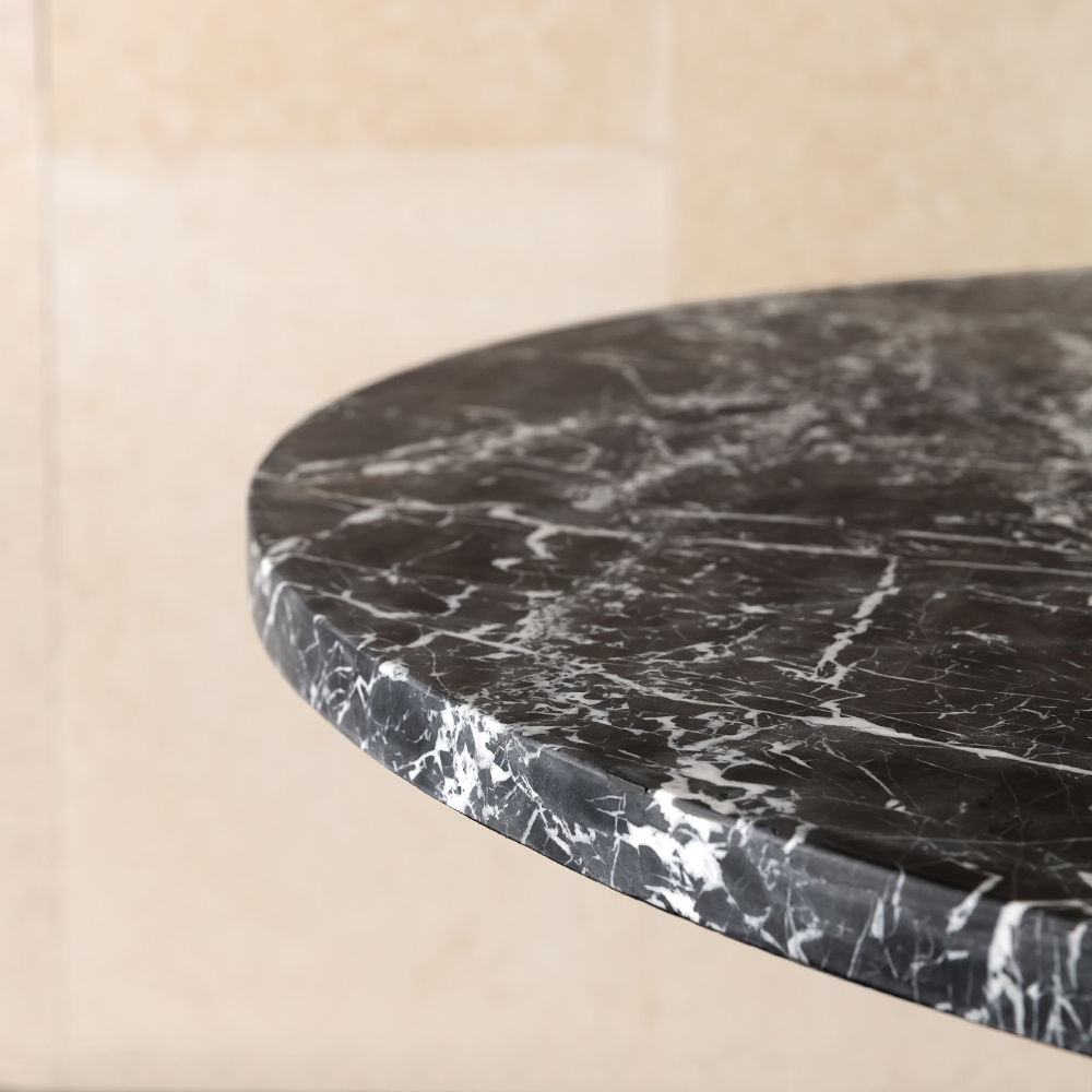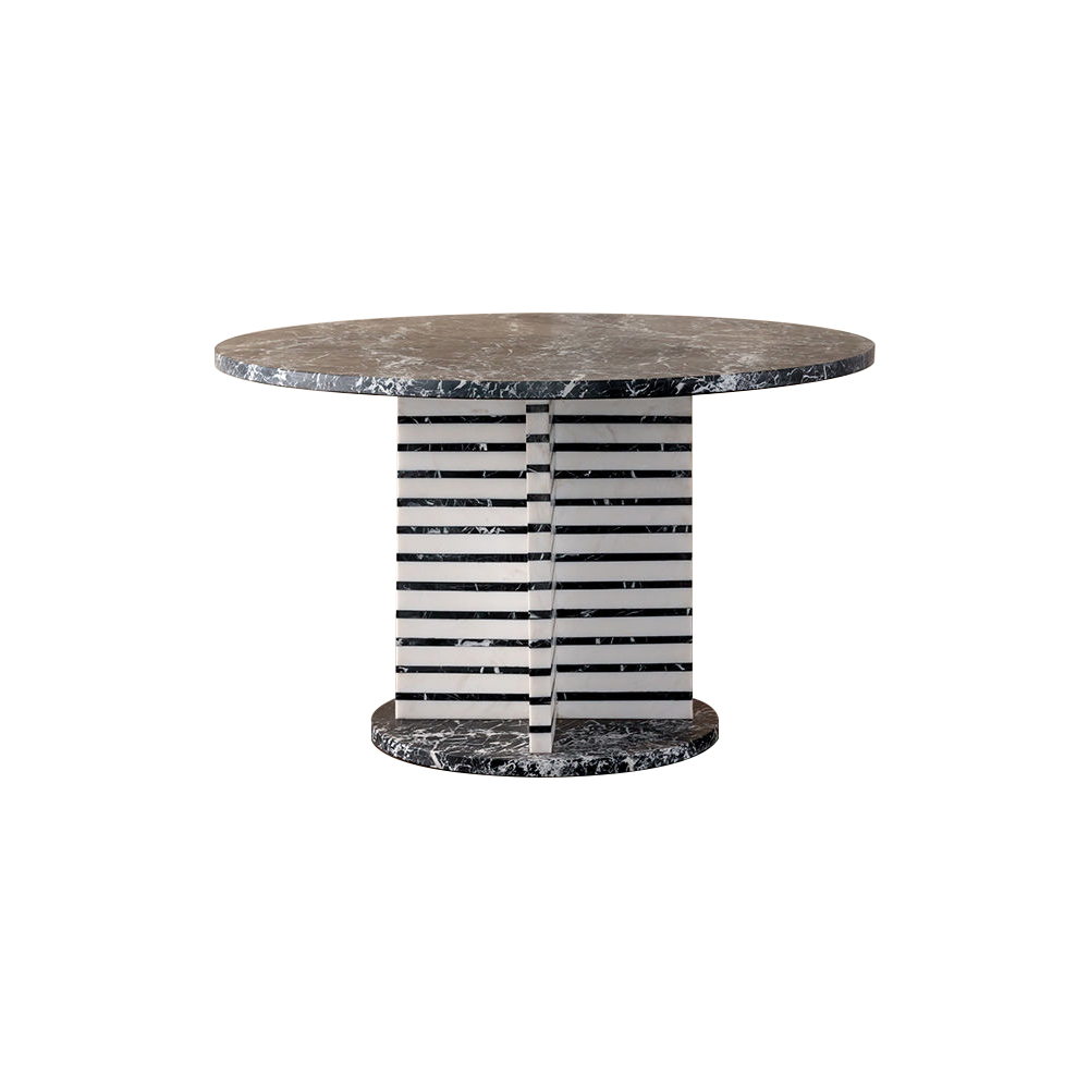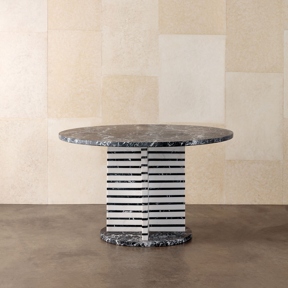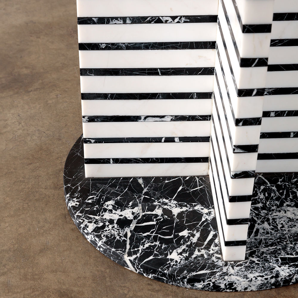 Lineage餐桌融合了混合大理石和建筑构造形式,体现了艺术与功能的现代二元性。 这款雕塑餐桌采用交替的天然黑色玛奎那和白色大理石层,并经过磨光处理。