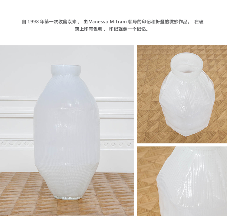 自1998年第一次收藏以来,由Vanessa Mitrani领导的印记和折叠的微妙作品。在玻璃上印有色调,印记就像一个记忆。 由此获得的折叠和刻面让人想起缅甸或日本寺庙的纸灯笼,这些灯笼标有Vanessa Mitrani。