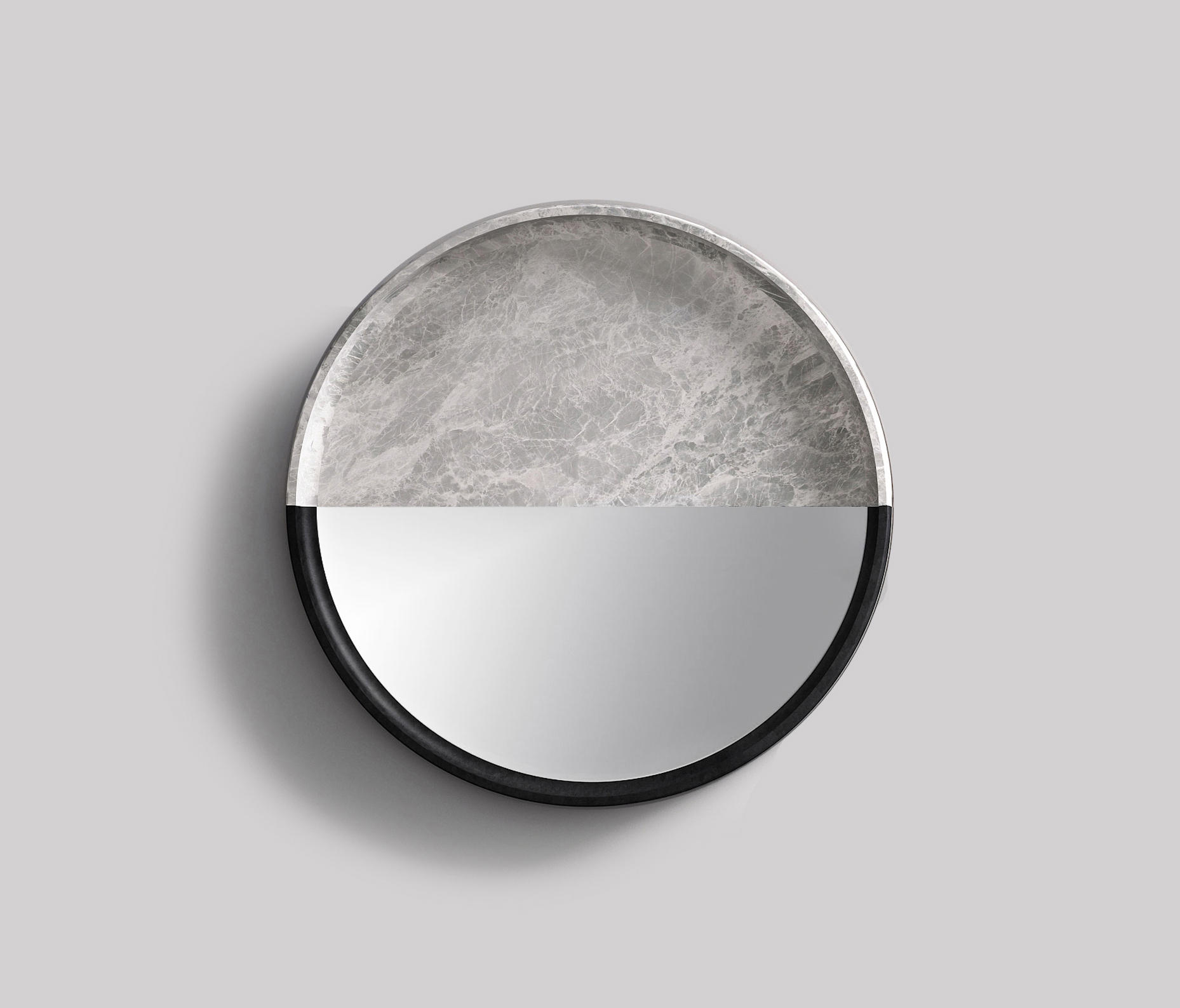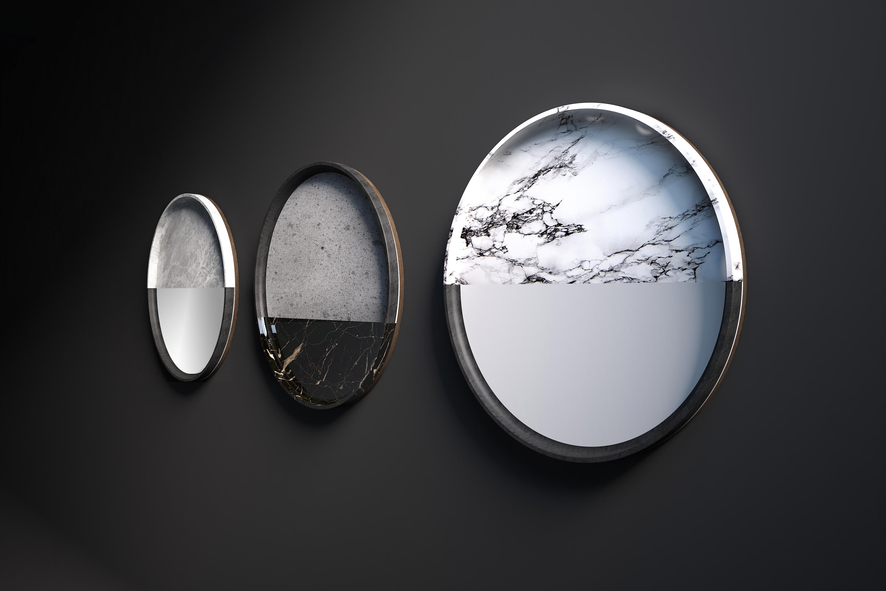 一系列镜子,玻璃增强了大理石和石头纹理。 轻盈和坚固,难以捉摸和存在,灯光和阴影:相反,吸引着基本和令人惊讶的形式。 悬挂在黑暗或明亮的墙壁上,一个接一个地,三个单元装饰明亮的房间设置。