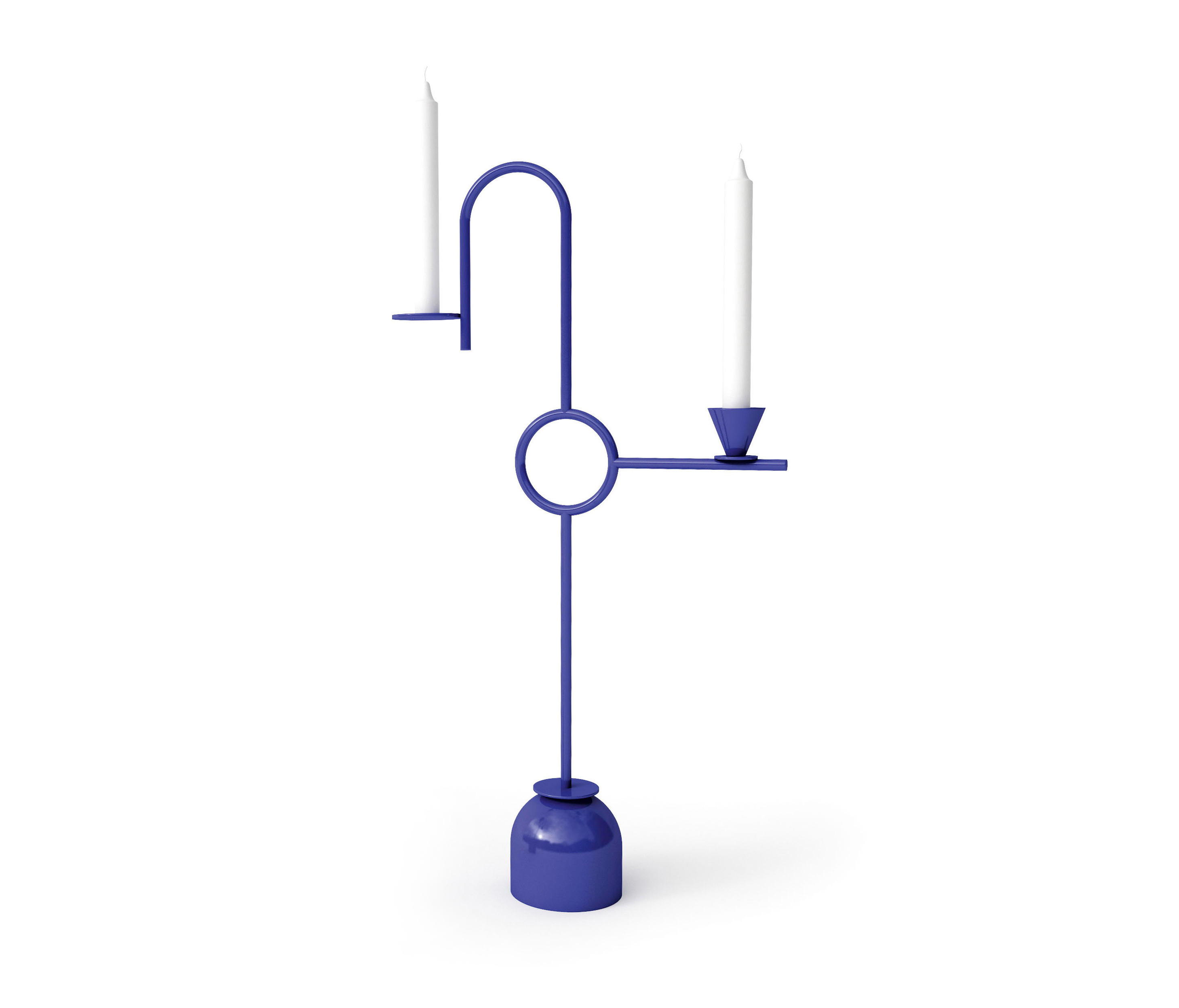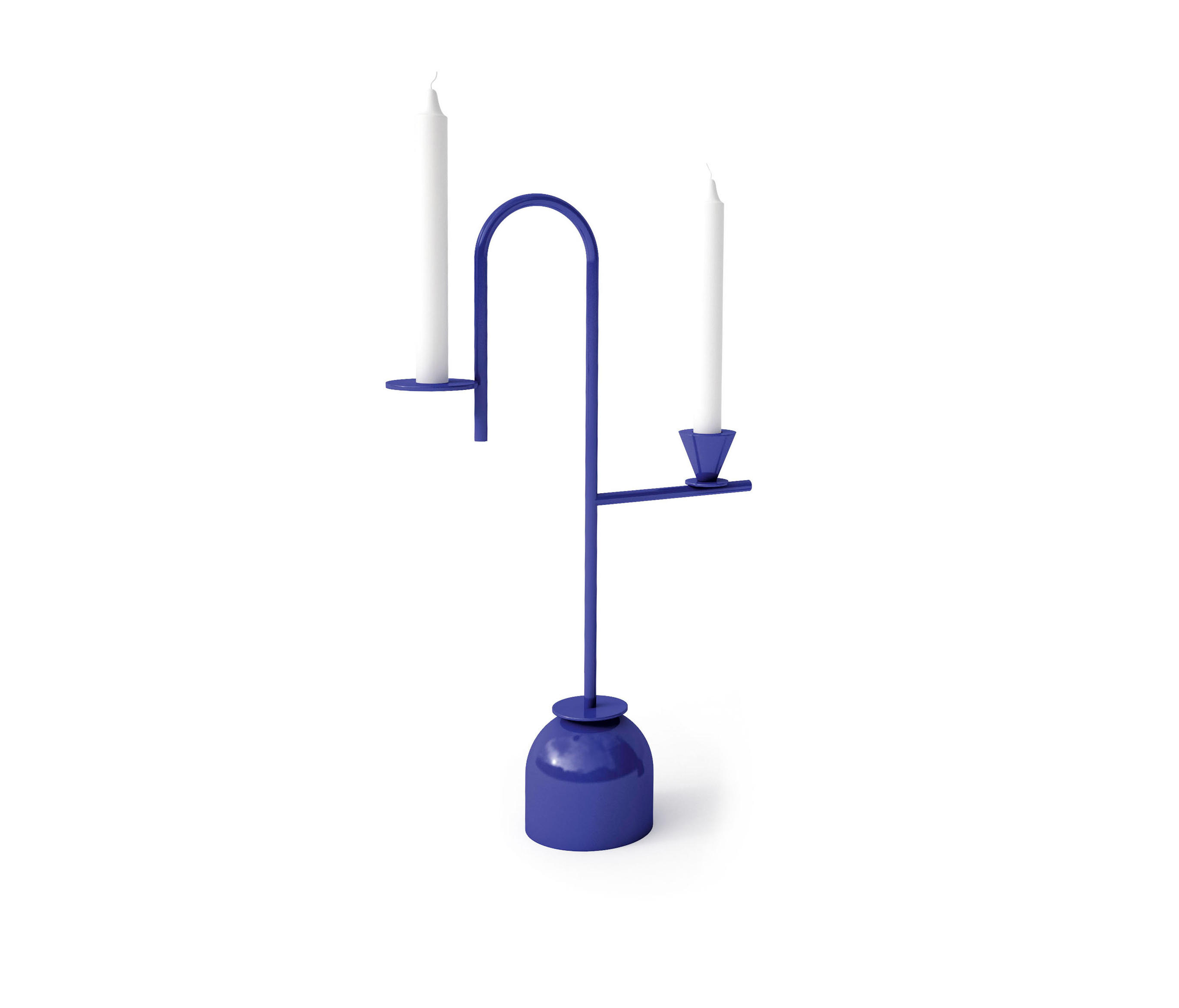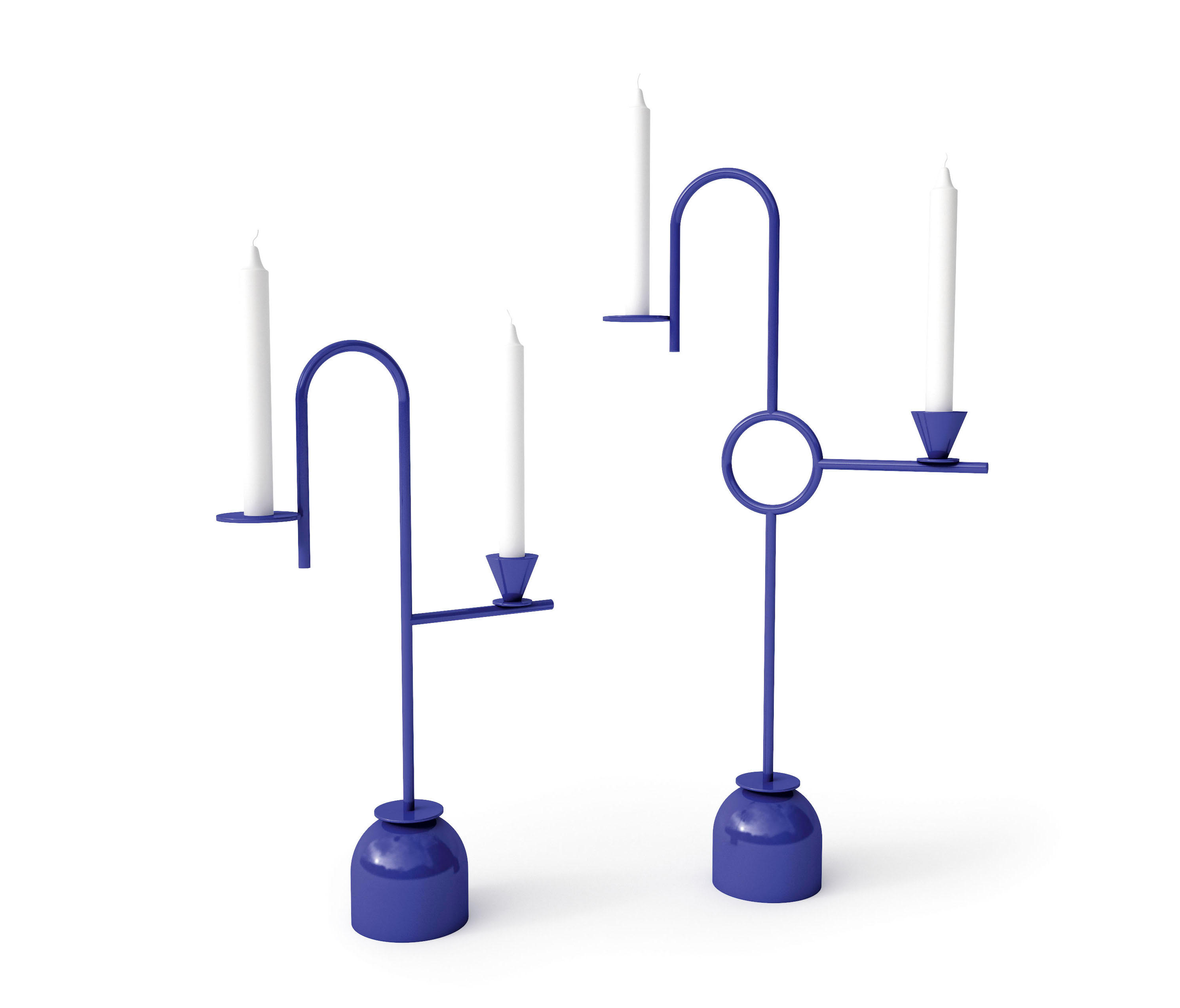 这对蓝色烛台优雅的几何形象是设计师Thomas Dariel设计的。 对于这个产品,他用细长的弯曲茎杆定义了空间,用靛蓝色照亮。蓝色烛台由弧形层压金属制成,带有金属底座。