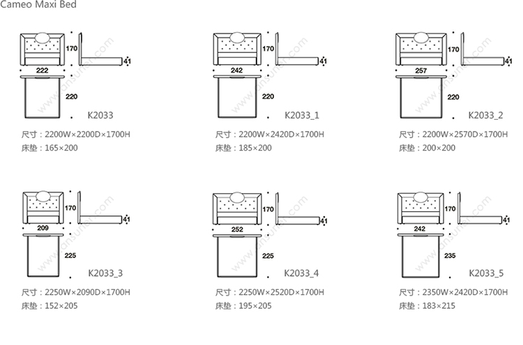 Cameo Maxi Bed 系列尺寸/示意图