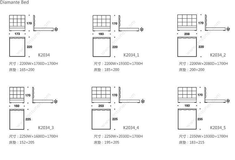 Diamante Bed 系列尺寸/示意图