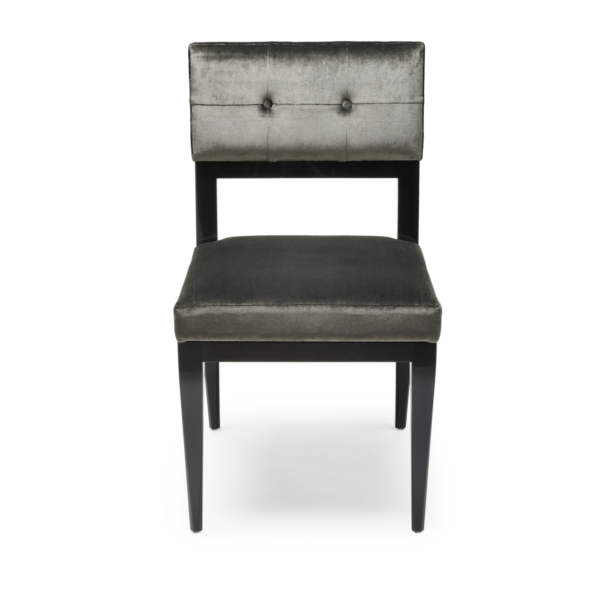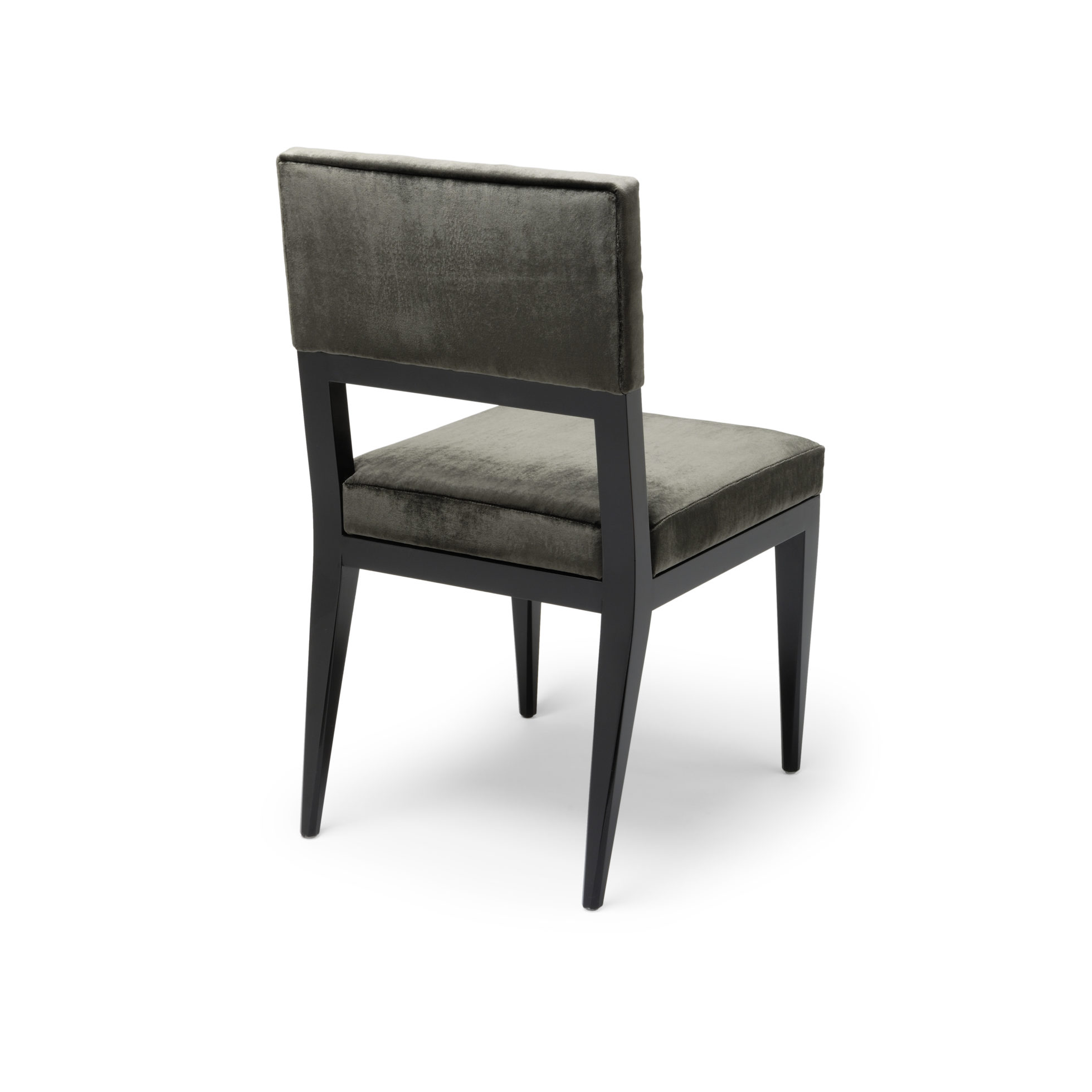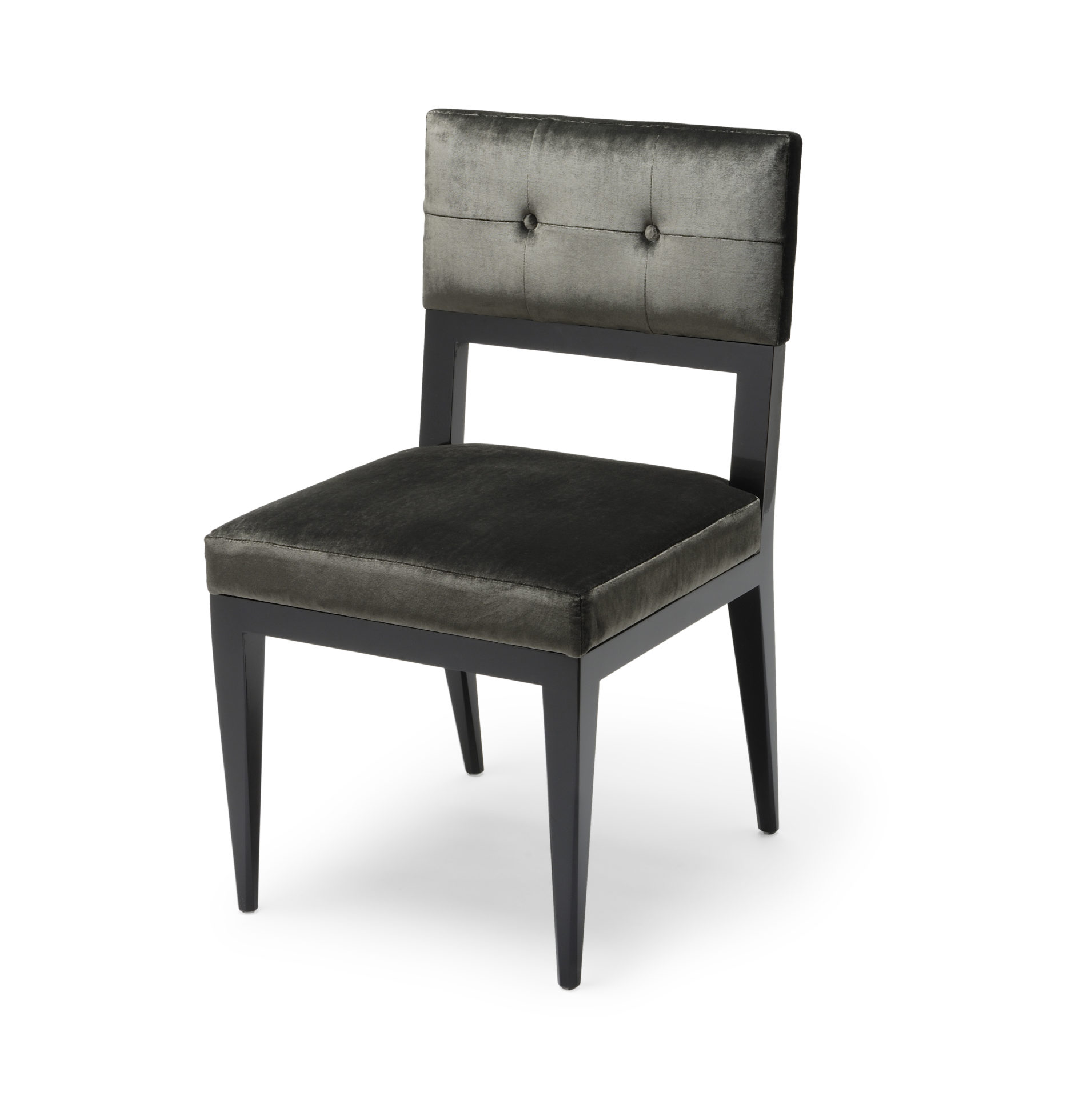 这张椅子是用炭丝天鹅绒装饰的,有结实的美国黑胡桃木缎腿。