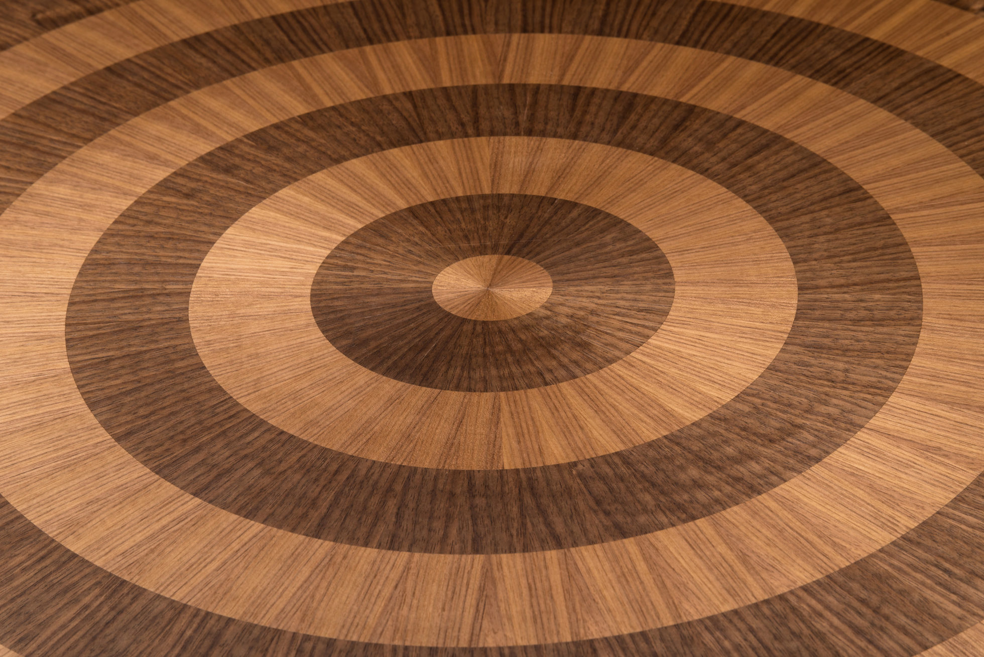光芒四射的浅色和深色胡桃木饰面突破了我们超凡脱俗的Astral餐桌的表面,它们的生命环仅由坚实的胡桃木装饰和锚固基座限制。
