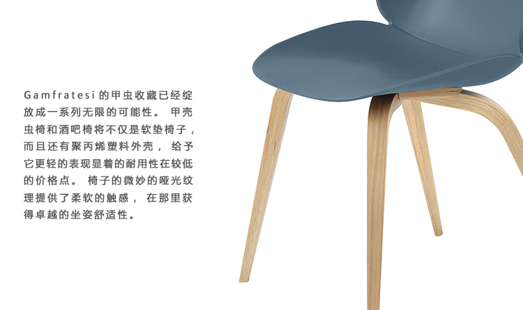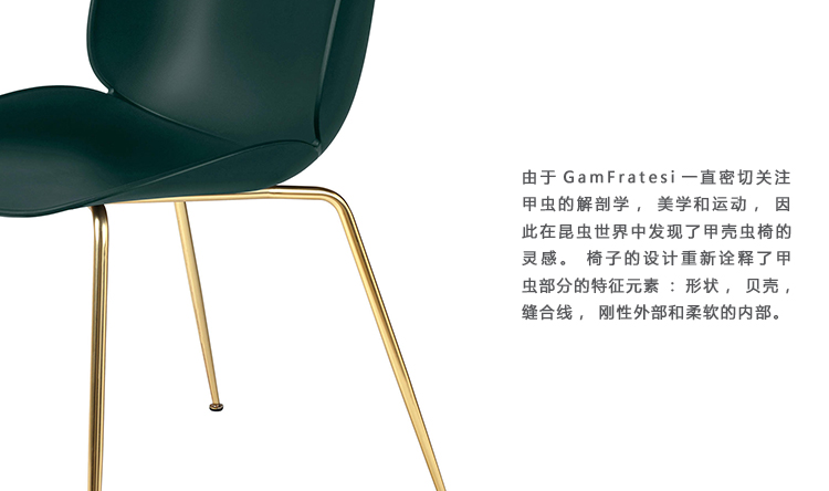由于GamFratesi一直密切关注甲虫的解剖学,美学和运动,因此在昆虫世界中发现了甲壳虫椅的灵感。 椅子的设计重新诠释了甲虫部分的特征元素:形状,贝壳,缝合线,刚性外部和柔软的内部。